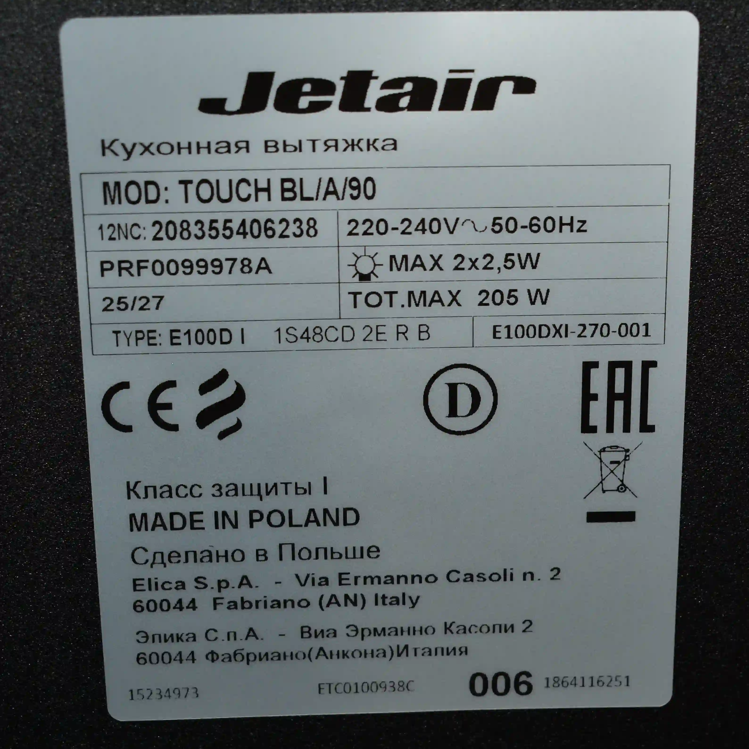 Вытяжка каминная JET AIR TOUCH BL/A/90-PRF0099978A k4 000070304