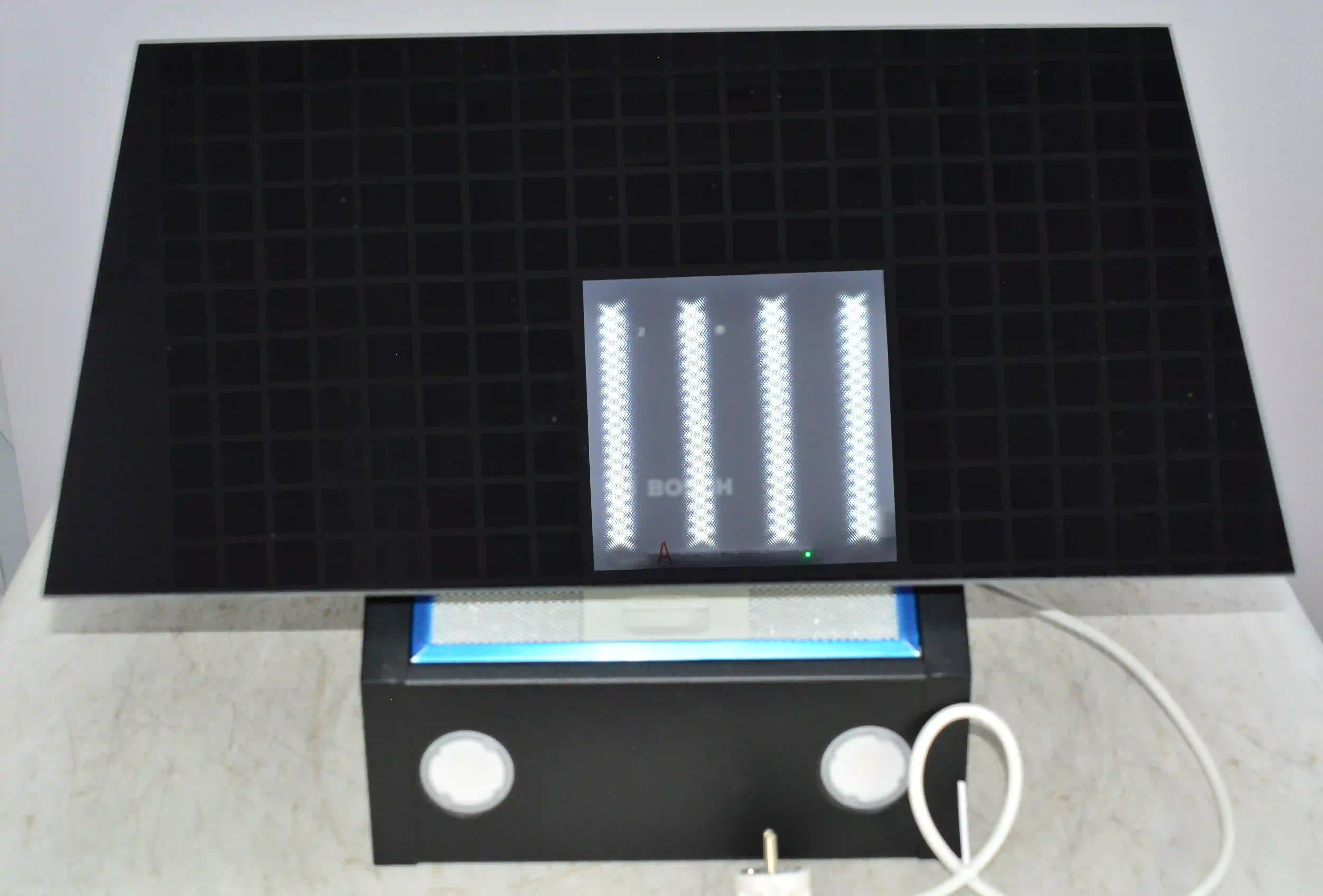 Энергоэффективные LED-лампы обеспечивают яркое и приятное освещение рабочей зоны, снижая нагрузку на глаза. Черный стеклянный корпус с наклонной конструкцией придает вытяжке современный и стильный вид.