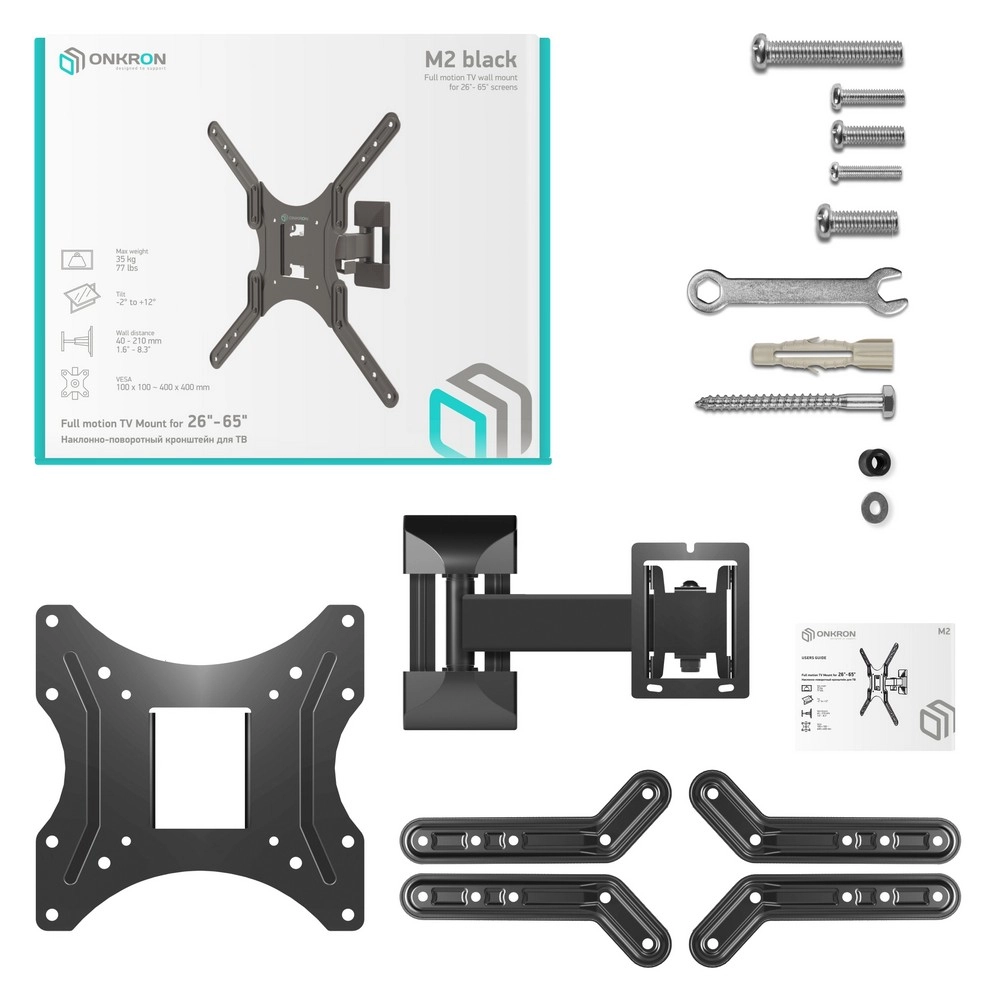 Настенный наклонно-поворотный кронштейн ONKRON M2 предназначен для ТВ с диагональю от 26 до 65 дюймов (66-165,1 см).