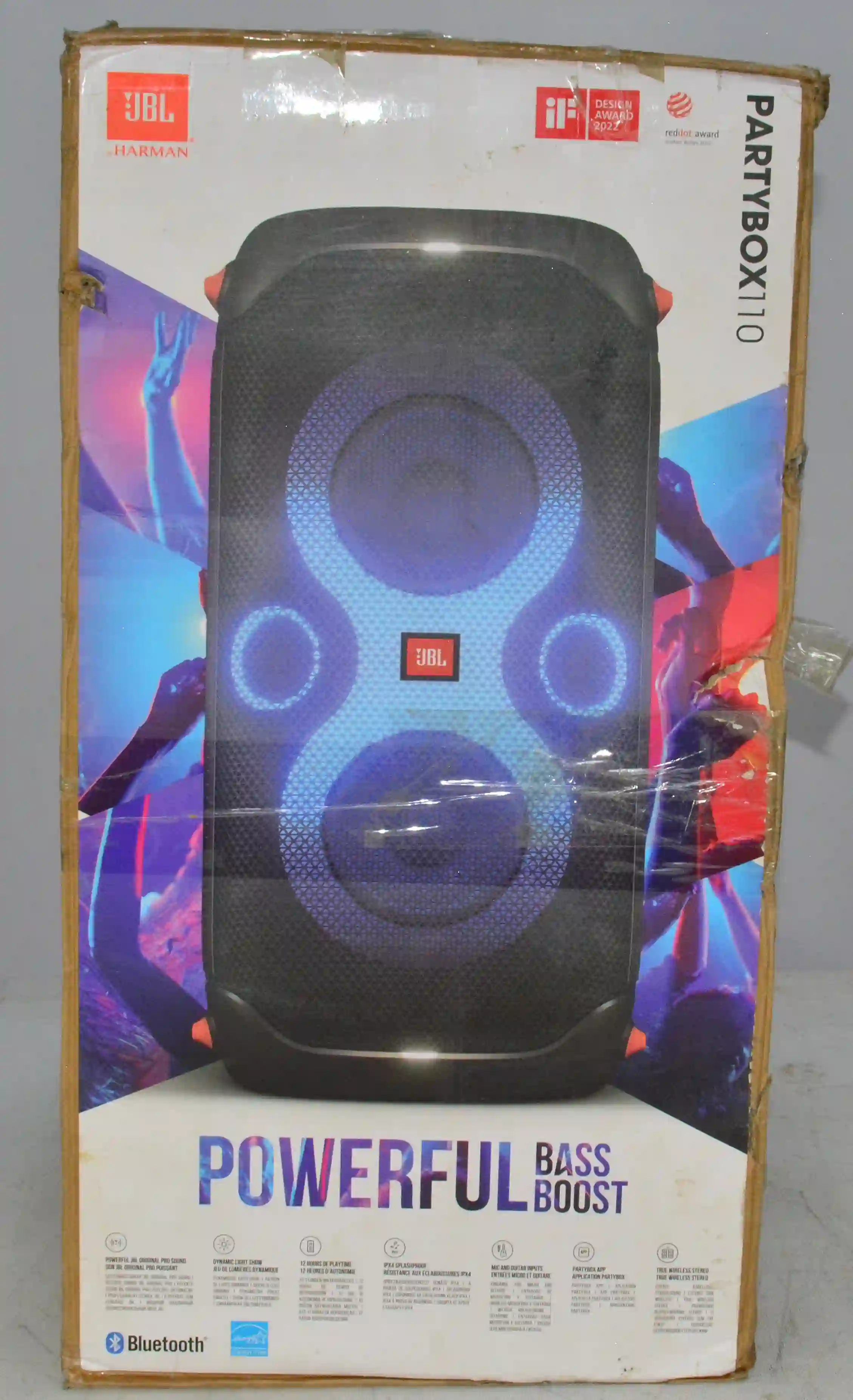 JBL PartyBox 110 оснащена мощным звуком в 160 Вт, что позволяет наполнить пространство качественным звучанием. Глубокие басы обеспечивают насыщенное и объемное звучание, идеально подходящее для вечеринок и мероприятий. Технология Bass Boost усиливает низкие частоты, создавая еще более впечатляющий звуковой эффект.