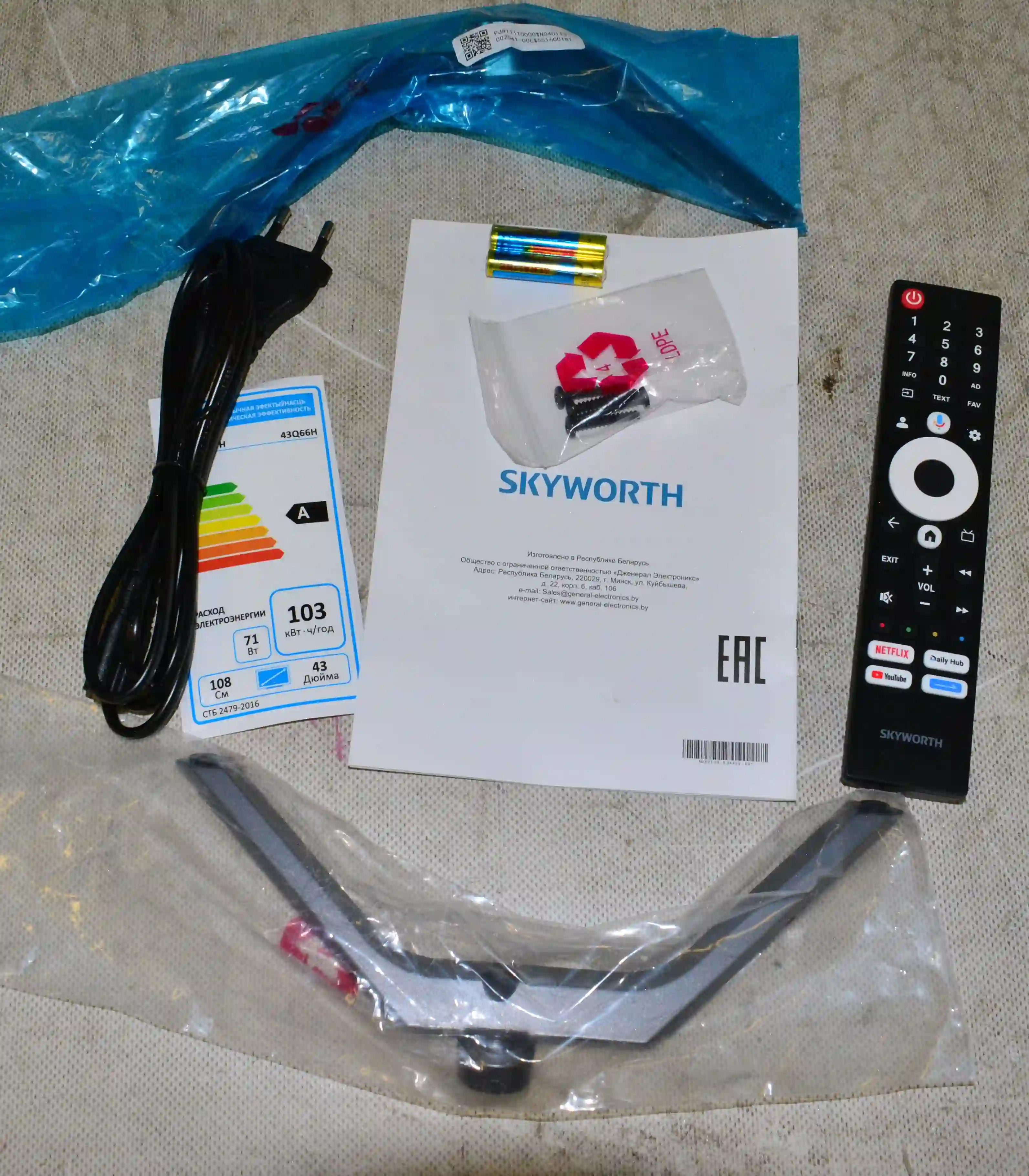 Комплектность: провод, документация, пульт, 2 ножки с болтами.