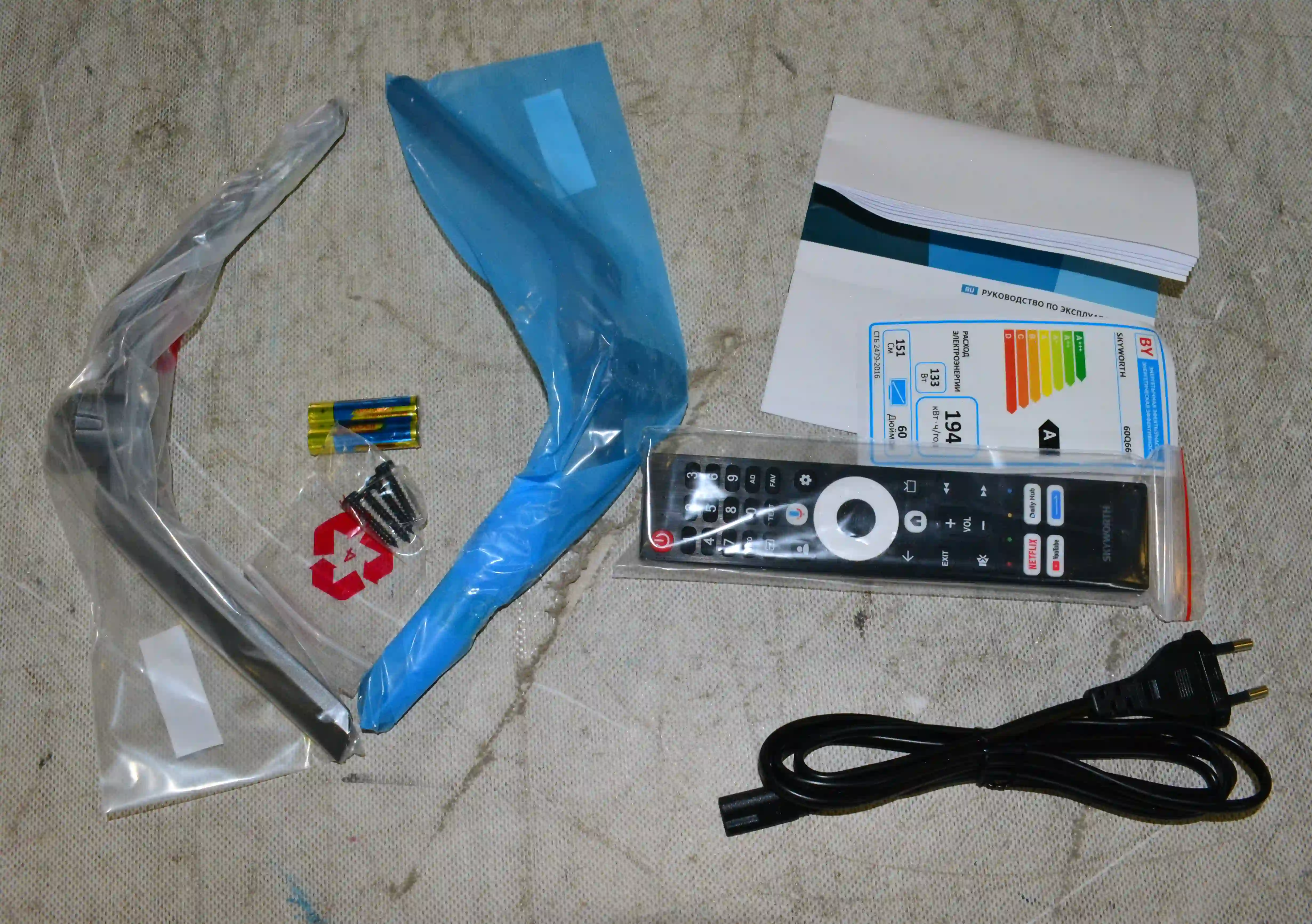 Комплектность: провод, документация, пульт, 2 ножки, винты, батарейки.