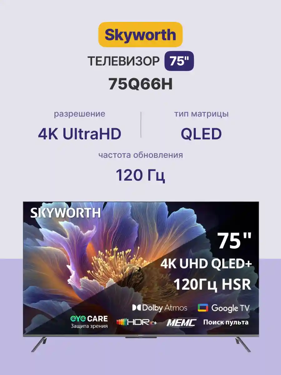 Телевизор Skyworth 75Q66H — это крупноформатный 75-дюймовый QLED 4K телевизор с современными технологиями изображения и звука. Он станет центром домашнего развлечения, предлагая яркую картинку, глубокий звук и стильный безрамочный дизайн.