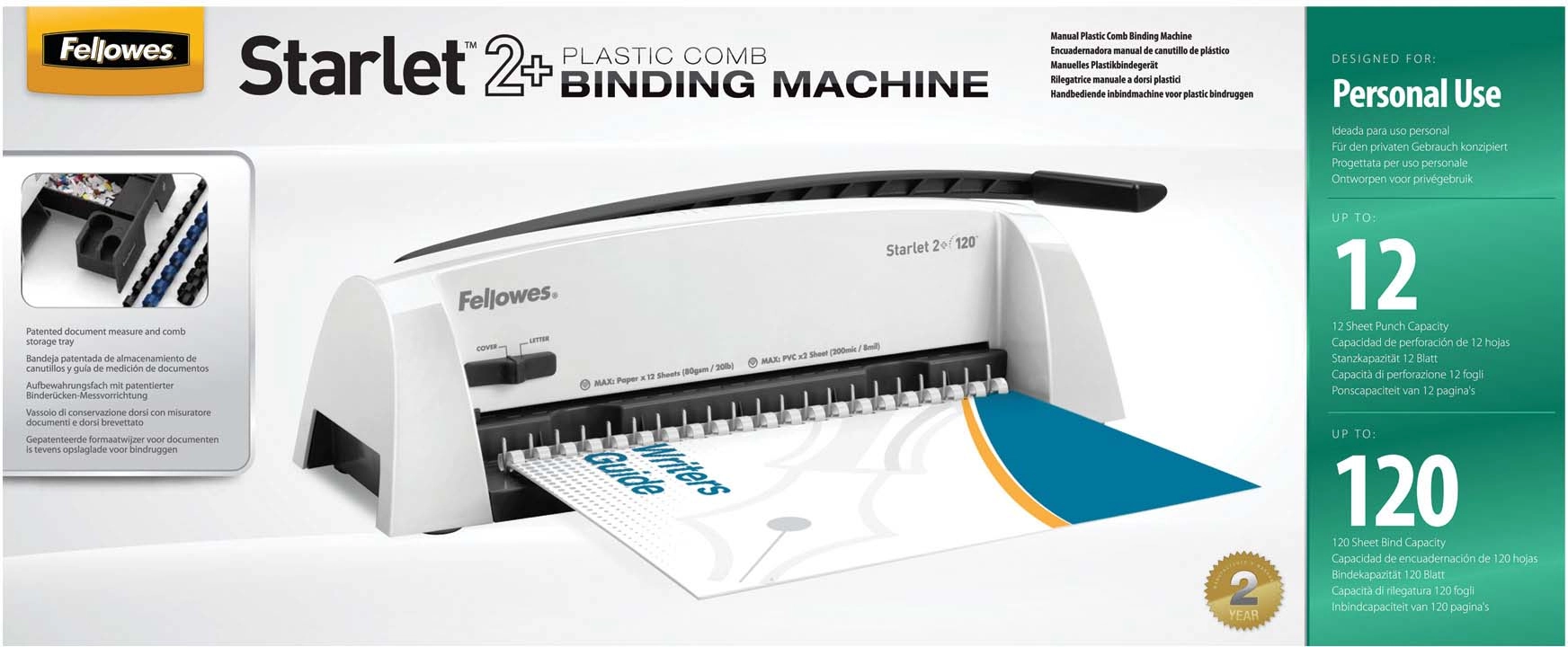 Недорогой начальный переплетчик Fellowes Starlet 2+ станет идеальным выбором для использования дома или в небольшом офисе. Максимальная толщина сшиваемой ограничена 120 листами, что вполне подходит для многих повседневных задач.