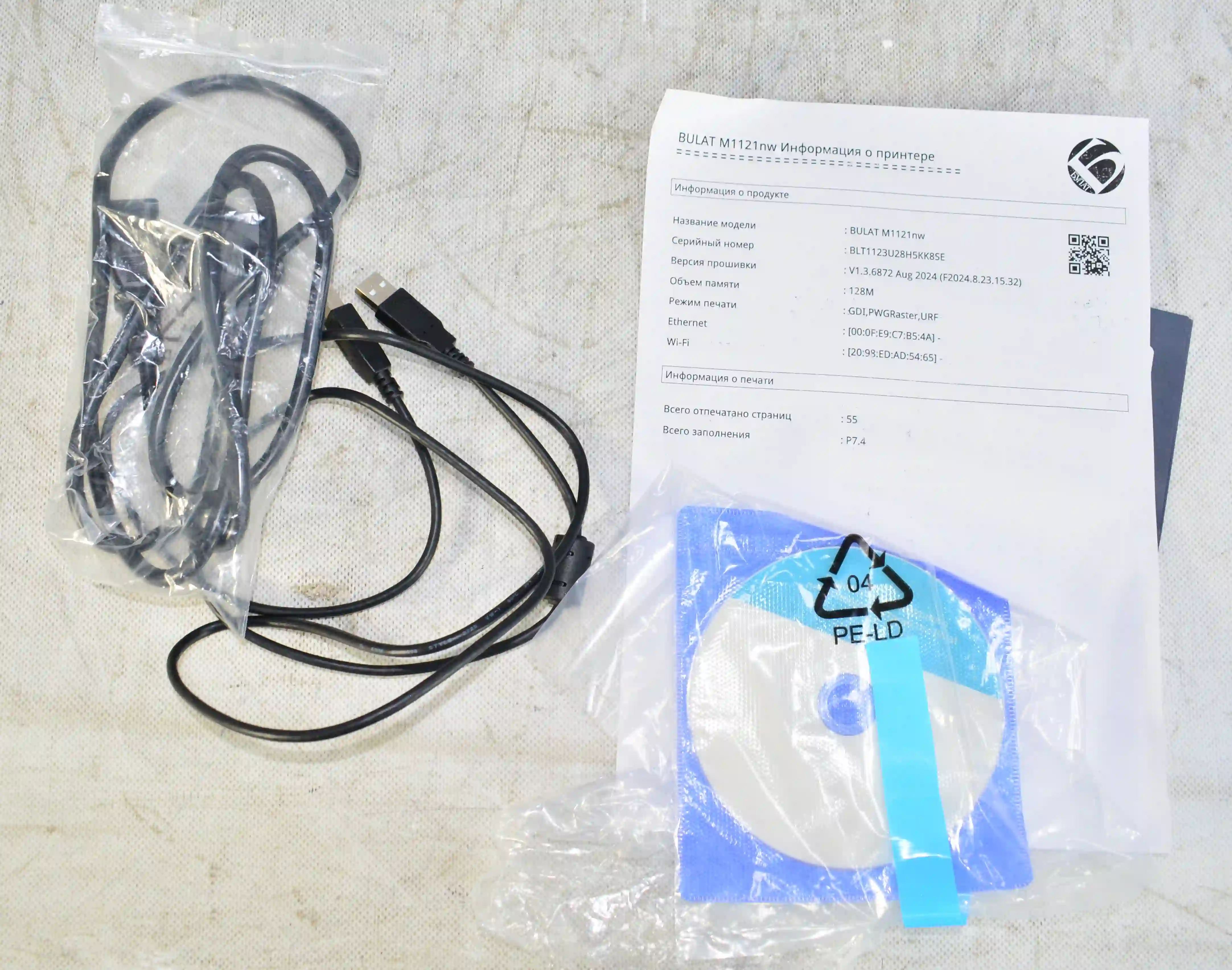 Комплектность: Документация, диск, кабель-2шт. Картридж установлен