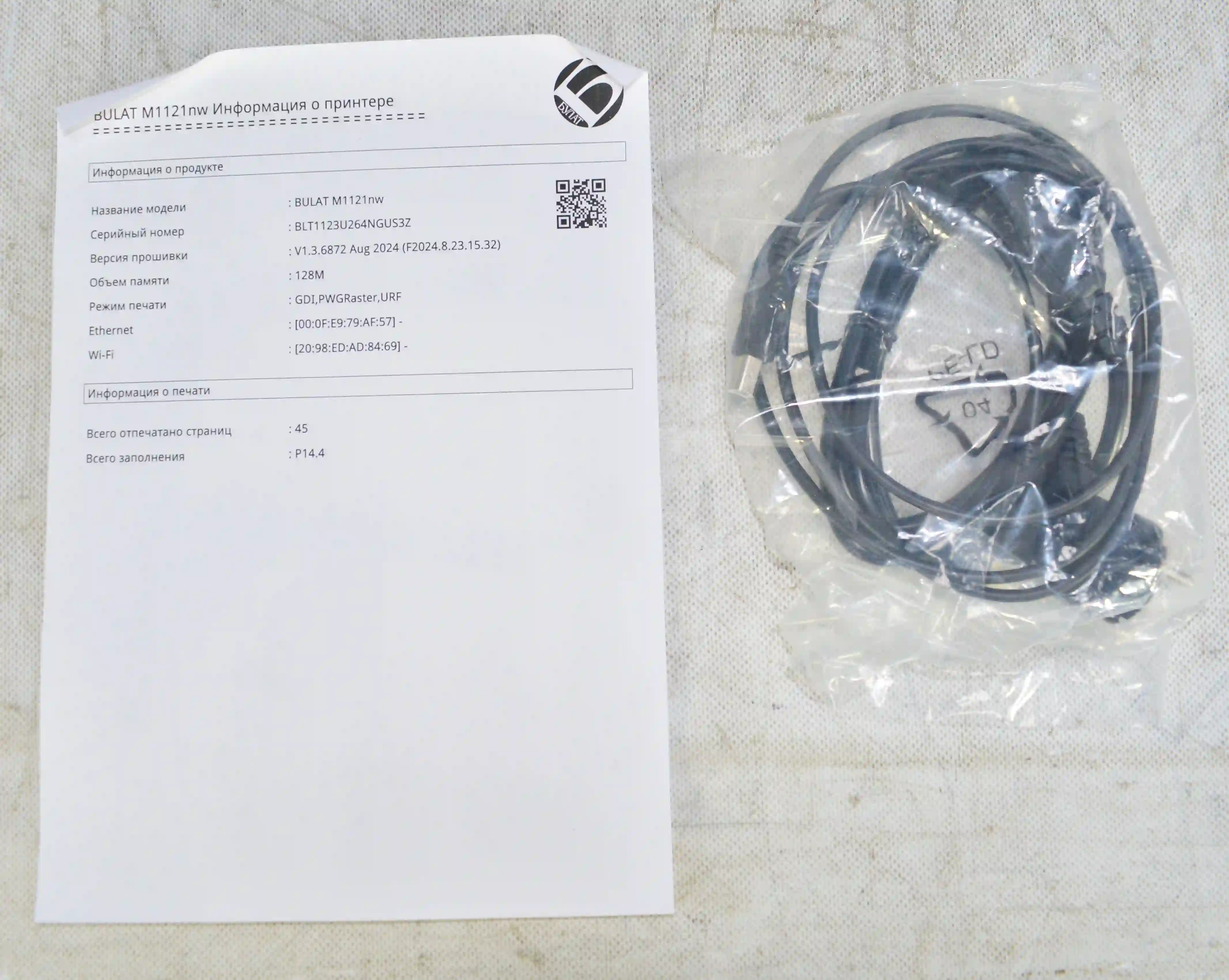 Комплектность: Документация, кабель, Картридж установлен