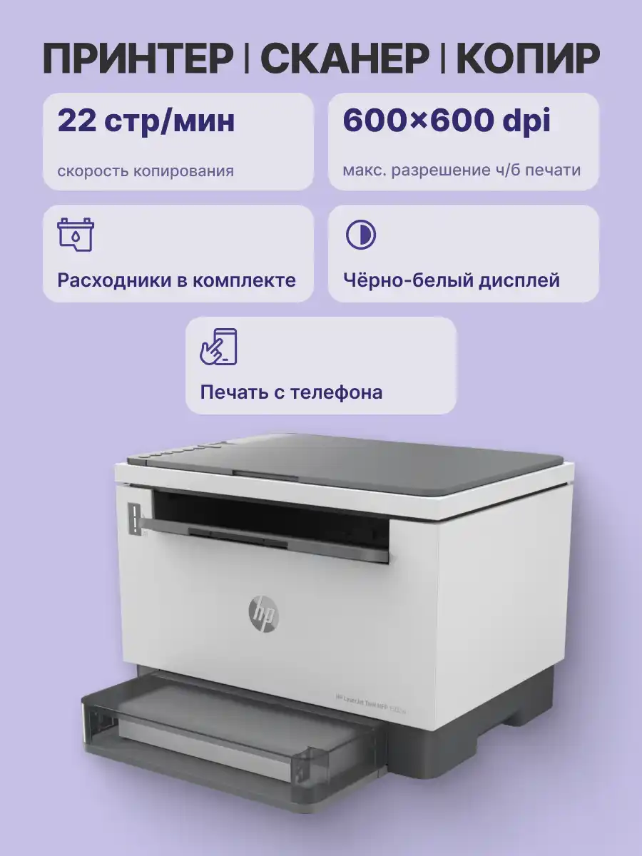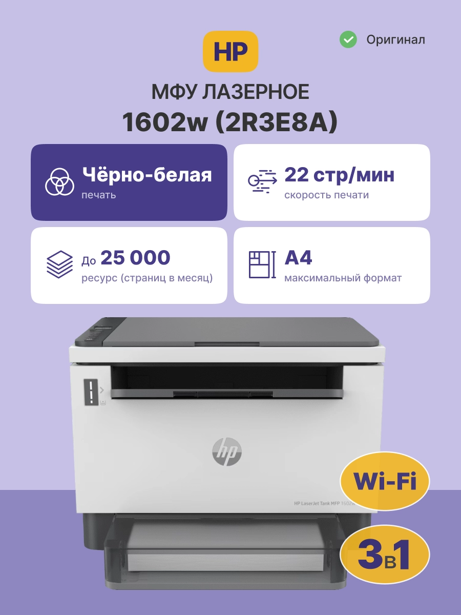 Лазерное МФУ HP LaserJet Tank MFP 1602w 2R3E8A с разрешением печати встроенного копира 600х600 т/д монохромного типа обеспечивает производительность до 25000 стр/мес.