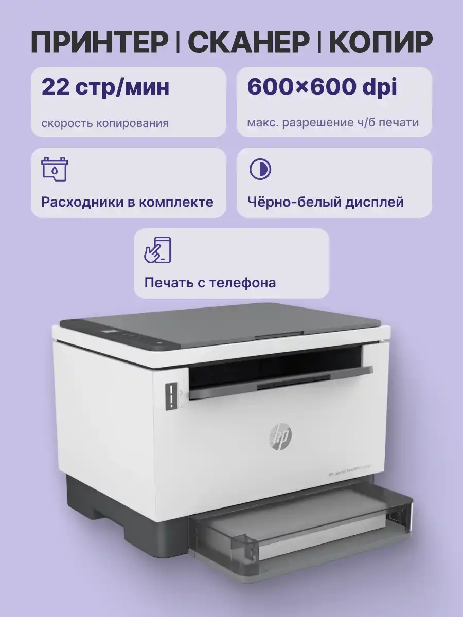 Лазерное МФУ HP LaserJet Tank MFP 2602dn 2R3F0A с разрешением печати встроенного копира 600х600 т/д монохромного типа обеспечивает производительность до 25000 стр/мес.