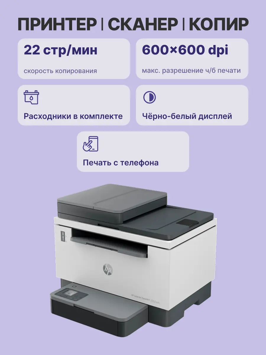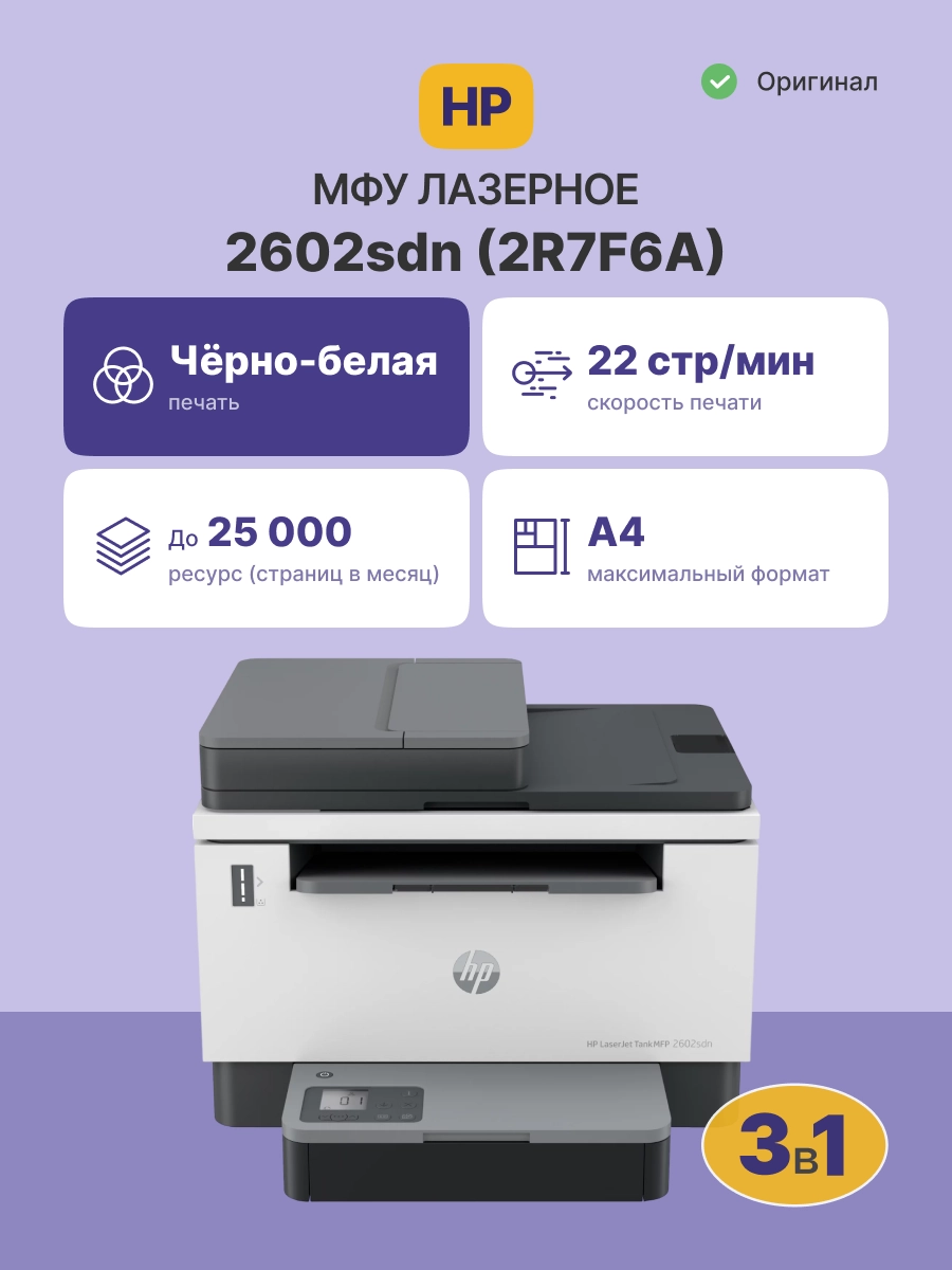 Лазерное МФУ HP LaserJet Tank MFP 2602sdn 2R7F6A с разрешением печати встроенного копира 600х600 т/д монохромного типа обеспечивает производительность до 25000 стр/мес.