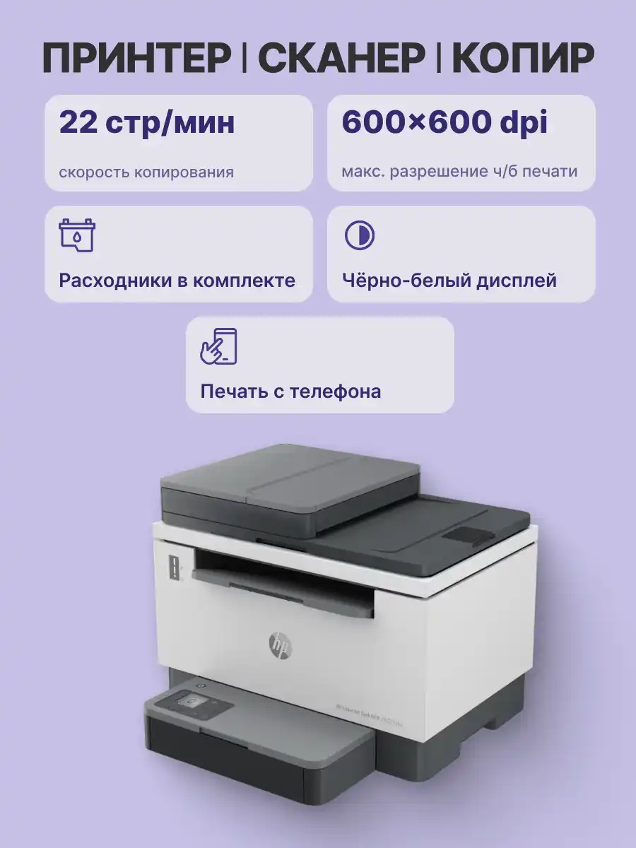 Лазерное МФУ HP LaserJet Tank MFP 2602sdw 2R7F5A с разрешением печати встроенного копира 600х600 т/д монохромного типа обеспечивает производительность до 25000 стр/мес.