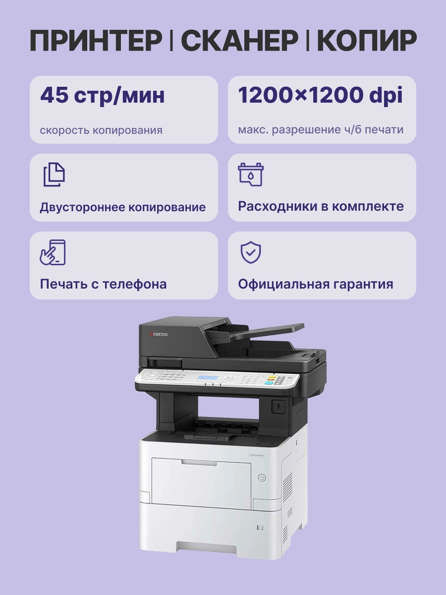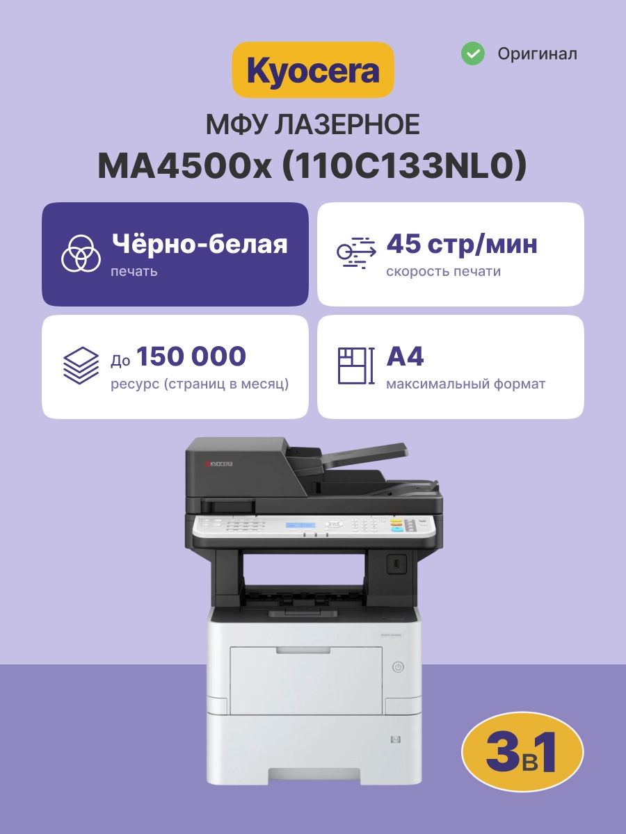 МФУ формата A4 с монохромной технологией печати и копирования Kyocera ECOSYS MA4500x – эффективное и надёжное устройство с самыми современными функциональными возможностями, необходимыми для обеспечения полного цикла документооборота компании. Копировальный аппарат со всеми необходимыми цифровыми функциями, реверсивный автоподатчик оригиналов ёмкостью 75 листов, принтер с модулем дуплекса и сетевым интерфейсом (стандарт RJ-45, разъём 8P8C) и цветной сканер с возможностью сканирования по сети, входящие в стандартный комплект поставки МФУ, с лёгкостью оптимизируют работу организации или крупного отдела компании и уменьшат общие эксплуатационные расходы. Копирование и сетевая печать со скоростью 45 стр./мин., автоподатчик документов реверсивного типа, большая максимальная месячная рабочая нагрузка, ускорят выполнение больших объёмов работы, а расширенные функциональные возможности электронной обработки документации и прекрасная расширяемость устройства, позволят ECOSYS MA4500x обеспечить полный цикл документооборота организации предоставив вам время для решения первоочередных задач компании.