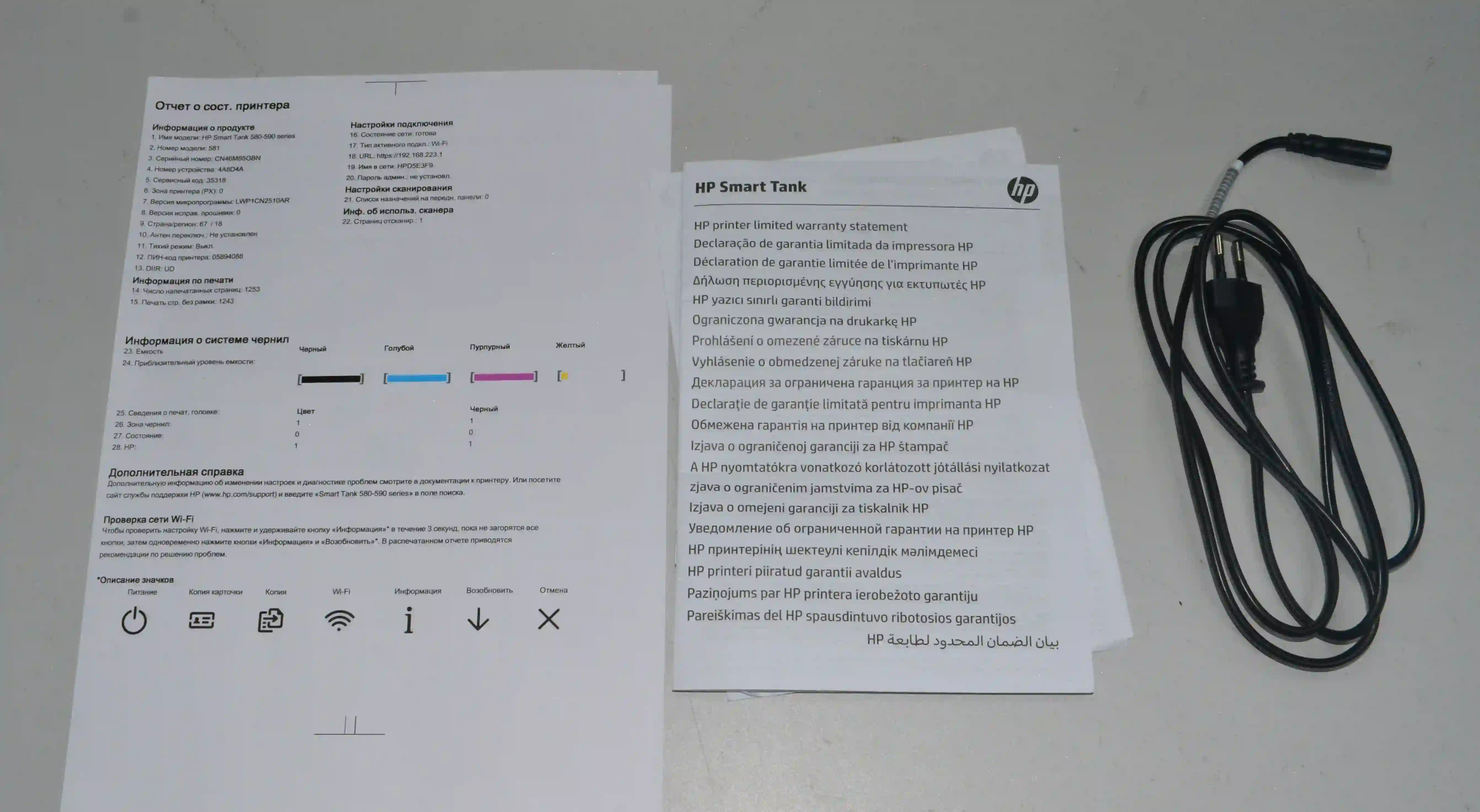 Комплектность: документация,кабель питания,(заправлена краска,вставлены картриджи)
