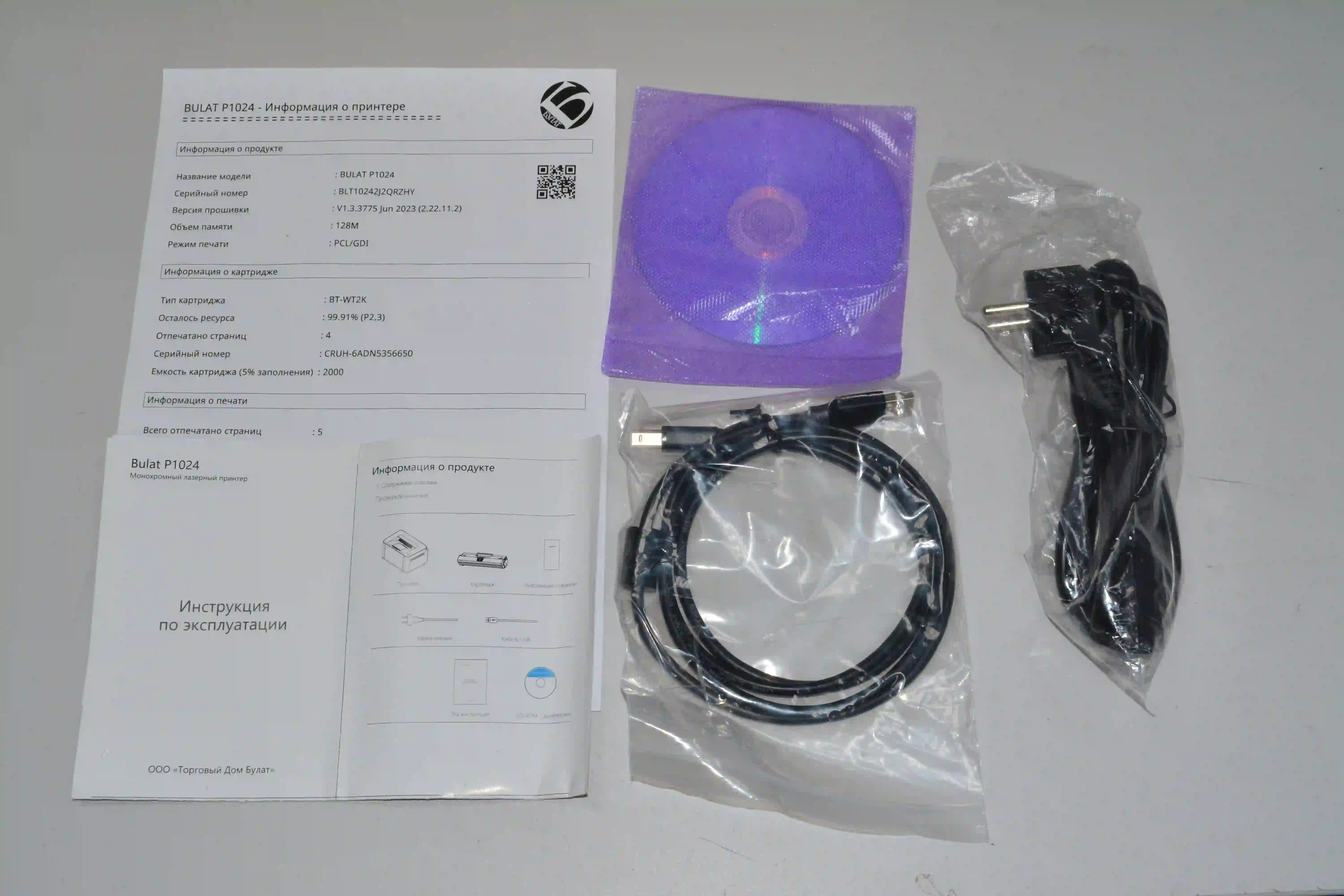 Комплектность: принтер,документация,диск,кабель питания,провод