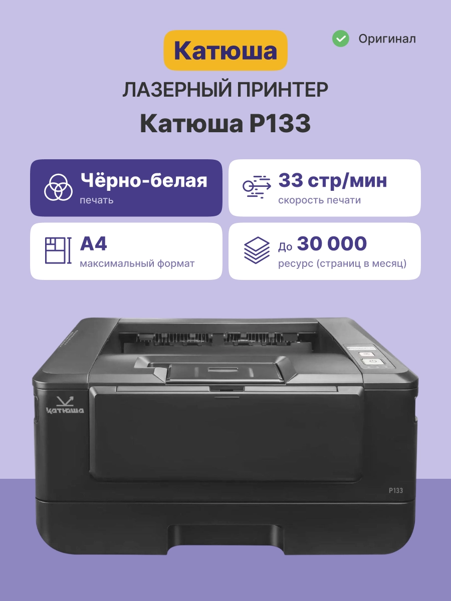 Принтер Катюша P133 — это высокопроизводительное устройство, предназначенное для монохромной печати. Он идеально подходит для офисов и домашних пользователей, которым требуется быстрая и качественная печать документов формата А4. Скорость печати 33 страницы в минуту и высокое разрешение 1200 dpi делают его отличным выбором для различных задач.
