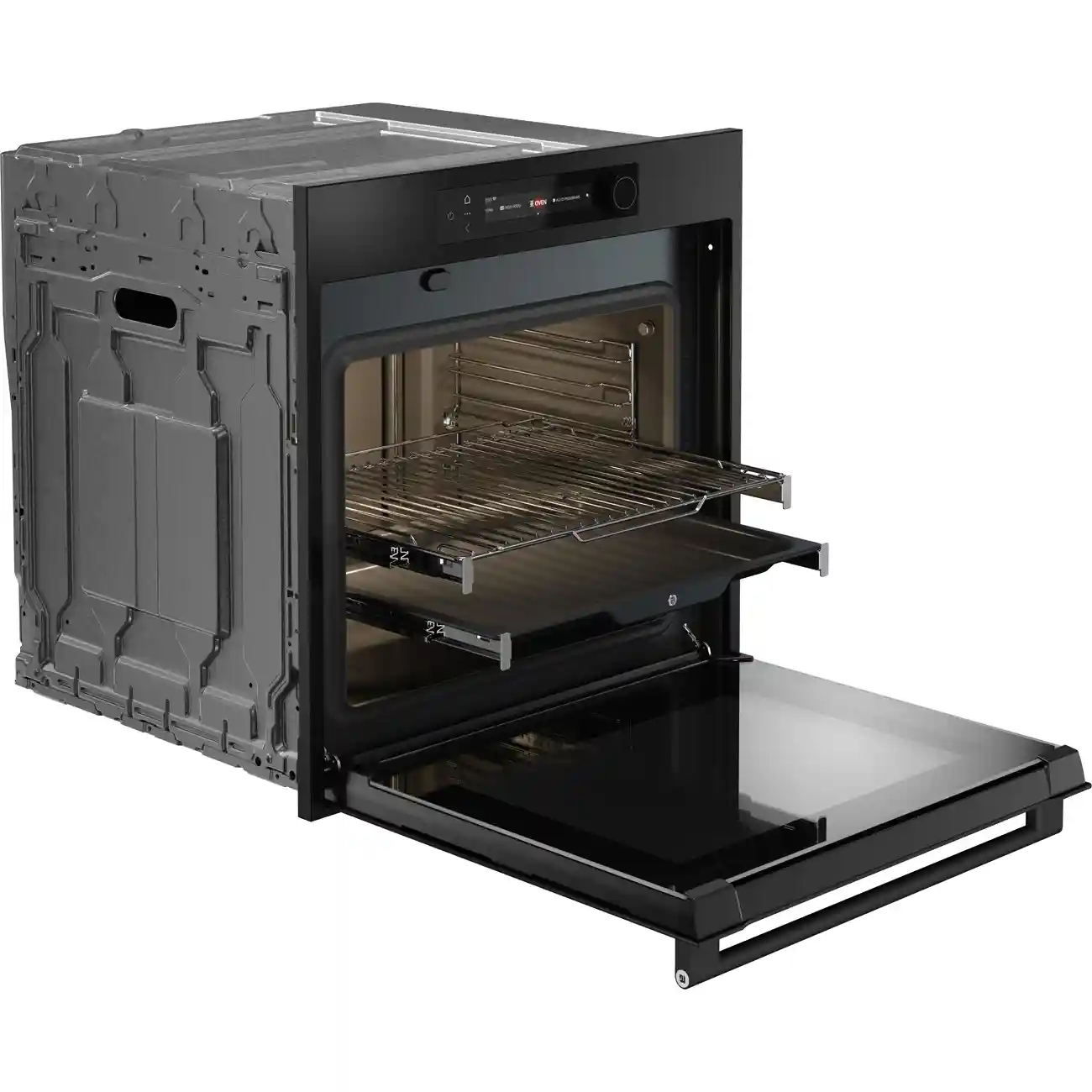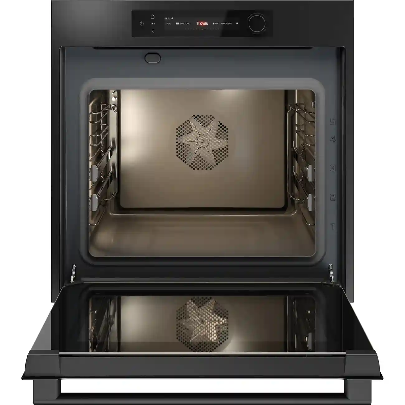 Цветной TFT-дисплей с сенсорными кнопками и поворотным переключателем обеспечивает удобную и наглядную настройку параметров. LED-освещение равномерно освещает камеру, а телескопические направляющие на двух уровнях позволяют безопасно и легко выдвигать противни. Система плавного открывания и закрывания повышает комфорт и долговечность эксплуатации.
