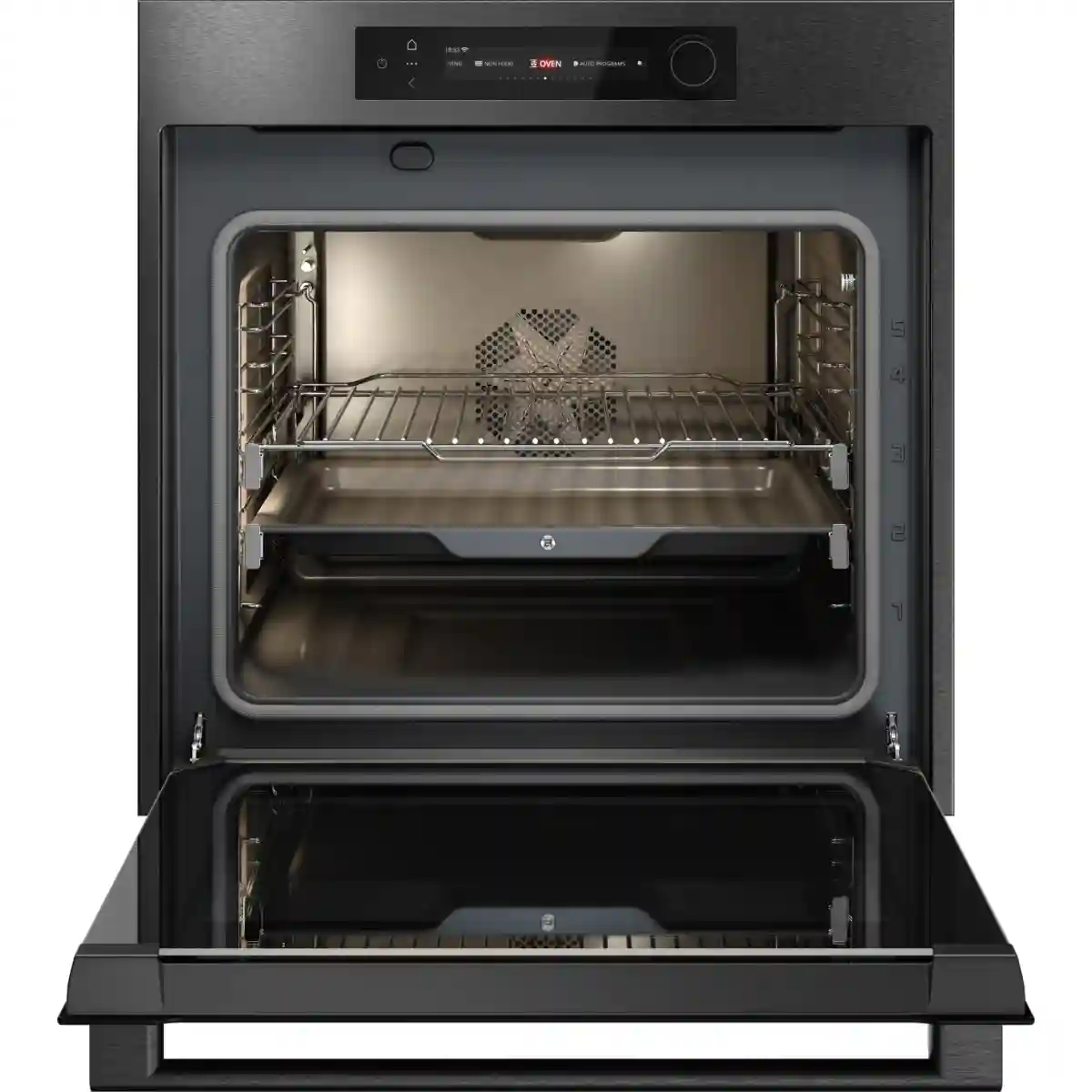 Объем камеры составляет 71 л, что позволяет разместить несколько противней на разных уровнях, запекать крупные куски мяса и птицу целиком.