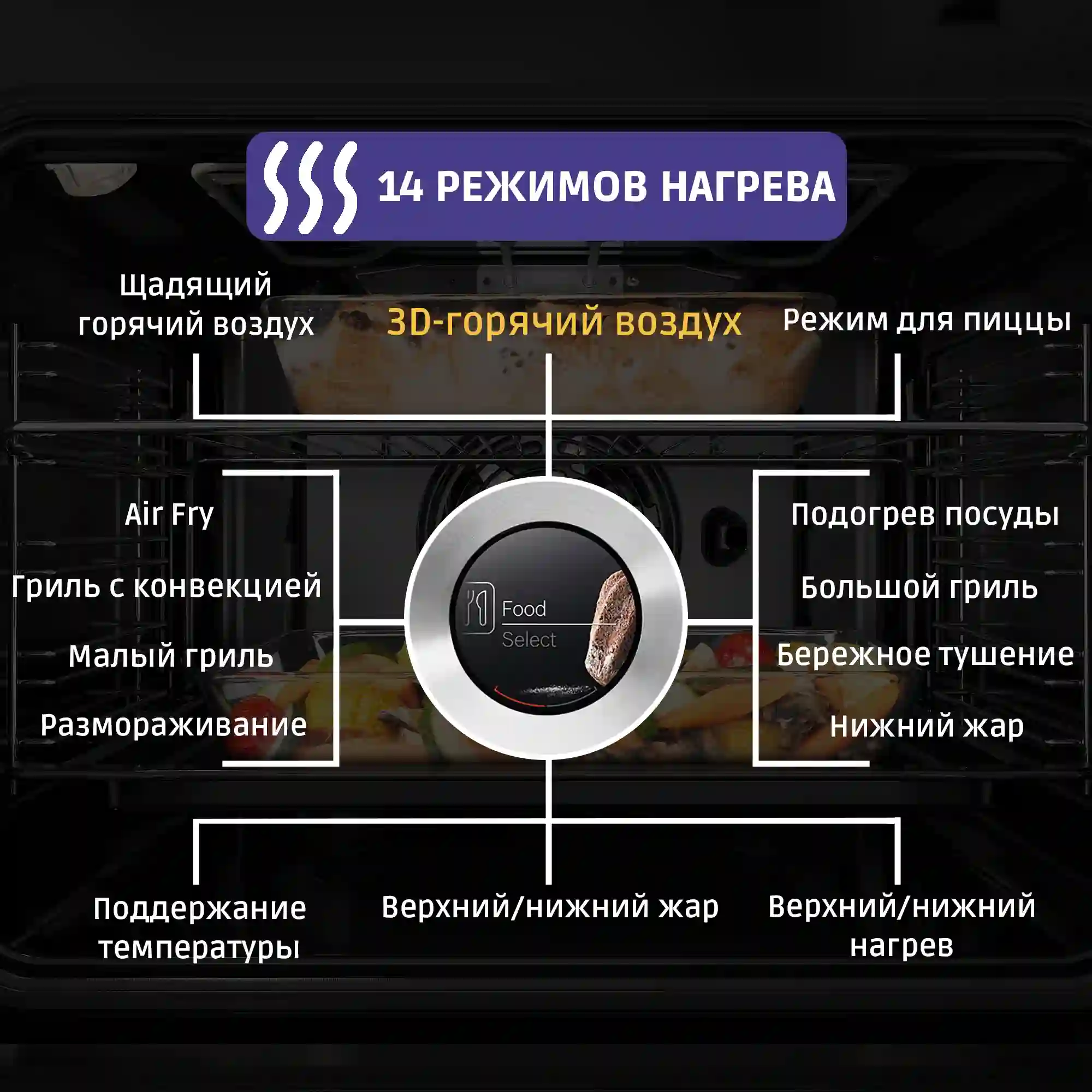 Объем шкафа составляет 71 литр, что позволяет приготовить большое количество блюд одновременно. Кроме того, шкаф оснащен 14 режимами нагрева, включая 3D-горячий воздух, горячий воздух Gentle, горячий воздух ECO, верхний/нижний жар, большой гриль, гриль с конвекцией, режим для пиццы, нижний жар, поддержание температуры и размораживание. Это обеспечивает гибкость при выборе метода приготовления и позволяет достичь идеального результата.