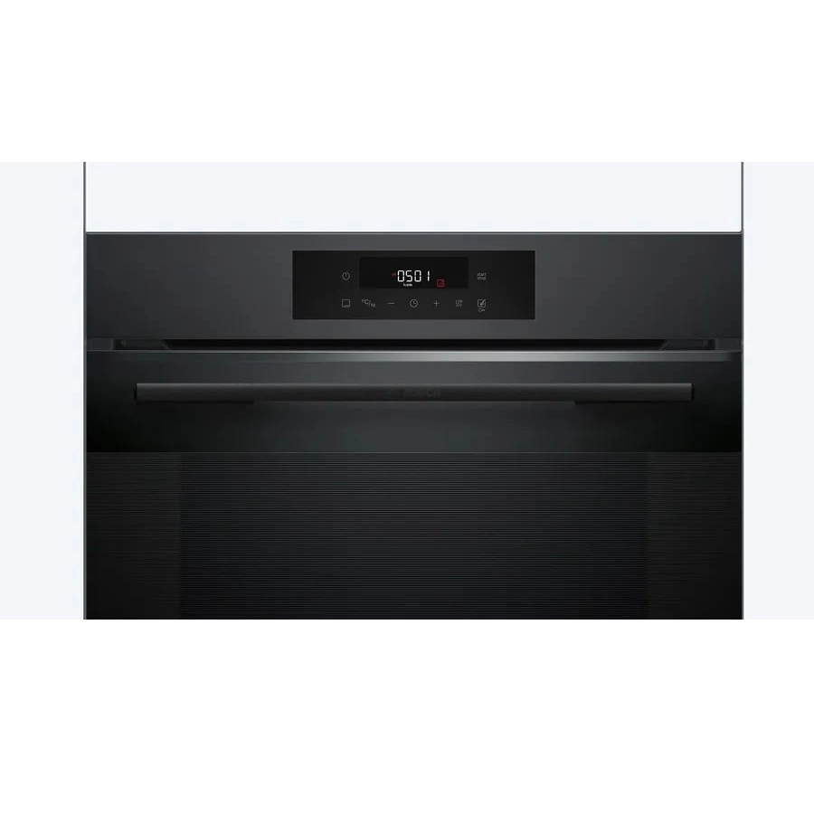 Электронное управление духового шкафа BOSCH Serie 6 HJG852YT0T с сенсорной панелью и цифровым дисплеем позволяет точно настраивать режимы работы, включая таймер, отложенный старт и автоматические программы.
