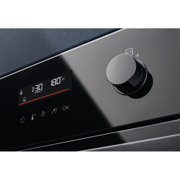Духовой шкаф оснащен комбинированной системой управления: сенсорным дисплеем и поворотными утапливаемыми переключателями. Таймер дает возможность выбрать продолжительность приготовления — когда заданное время истечет, отключение произойдет автоматически. Галогенное освещение камеры позволяет следить за приготовлением без необходимости открывать дверцу и нарушать температурный режим.