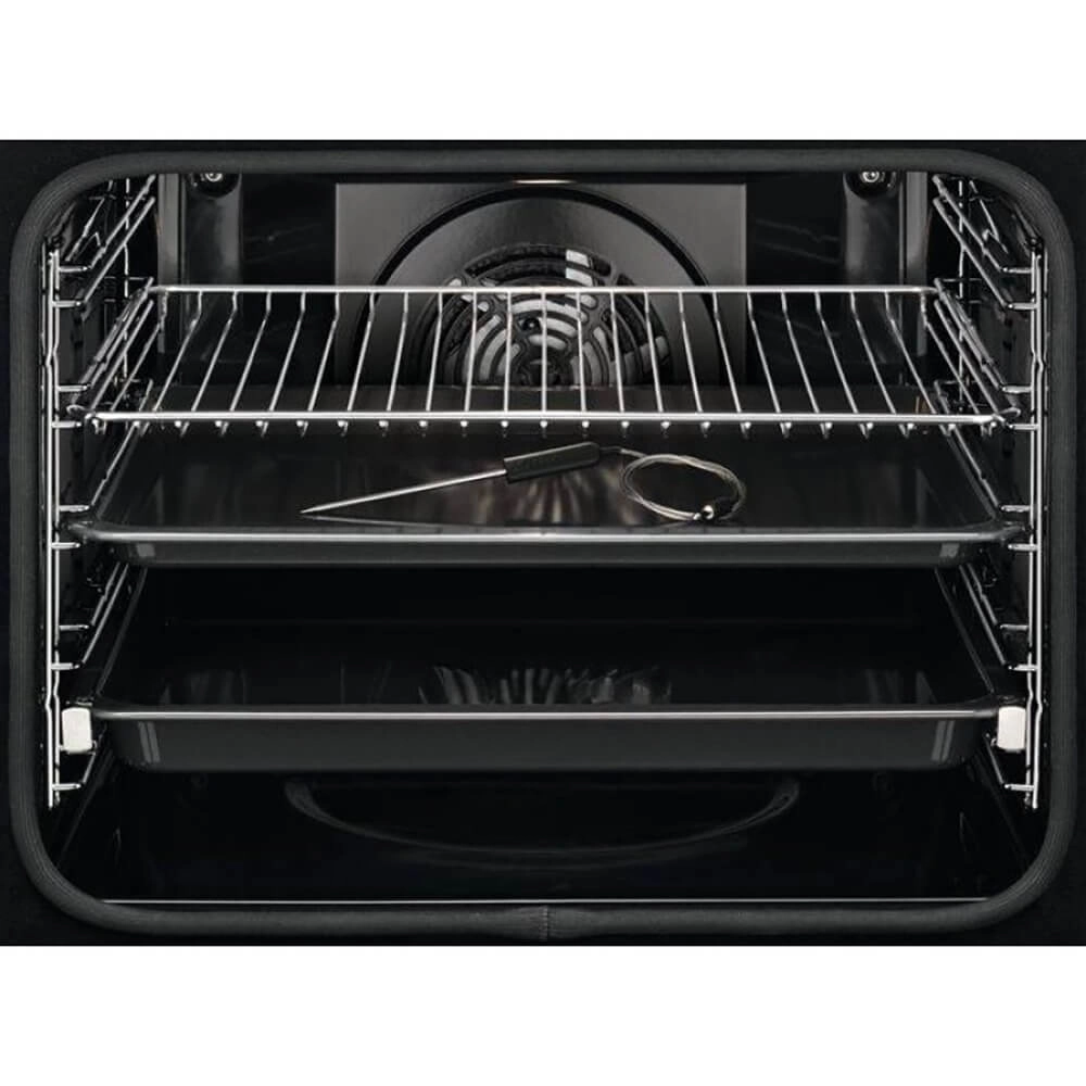 Дверца с тремя стеклами обеспечивает безопасность и удобный контроль за процессом приготовления. Проволочные и телескопические направляющие на одном уровне позволяют удобно размещать противни и блюда.