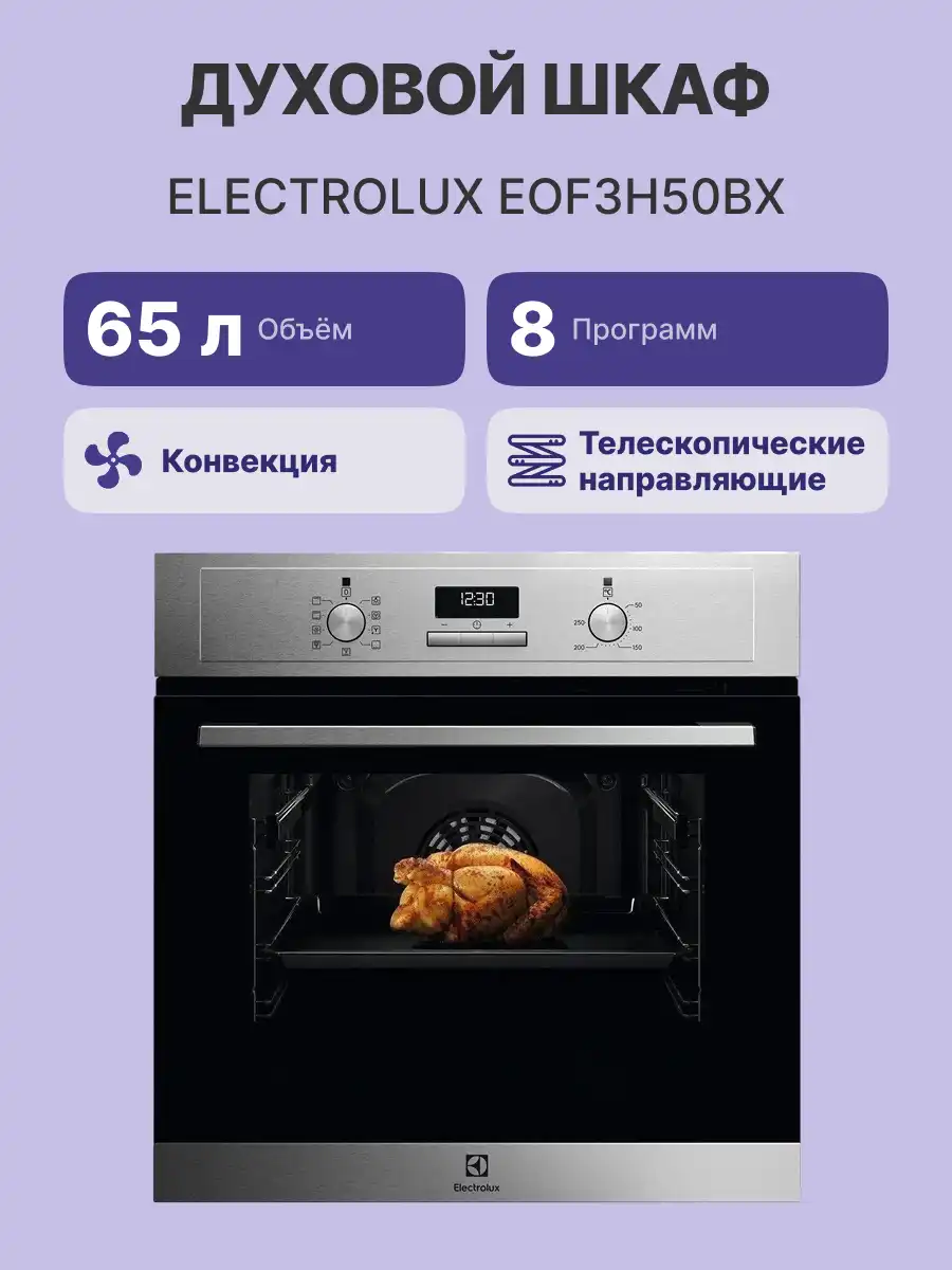Электрический духовой шкаф Electrolux EOF3H50BX может использоваться для запекания крупной птицы целиком или приготовления пищи на нескольких уровнях одновременно. Это обеспечивается благодаря отделению с полезным объемом 65 л.