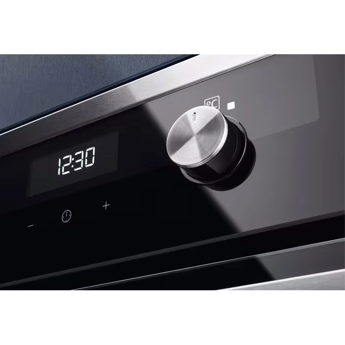 Для управления настройками предусмотрена панель с механическими утапливаемыми регуляторами и сенсорными кнопками для активации таймера, дисплеем для отображения времени. Каталитическая очистка оптимальна для удаления загрязнений на внутренней поверхности камеры. Для фиксации противней из набора предусмотрено пять уровней. Галогенное освещение удобно для наблюдения за содержимым.