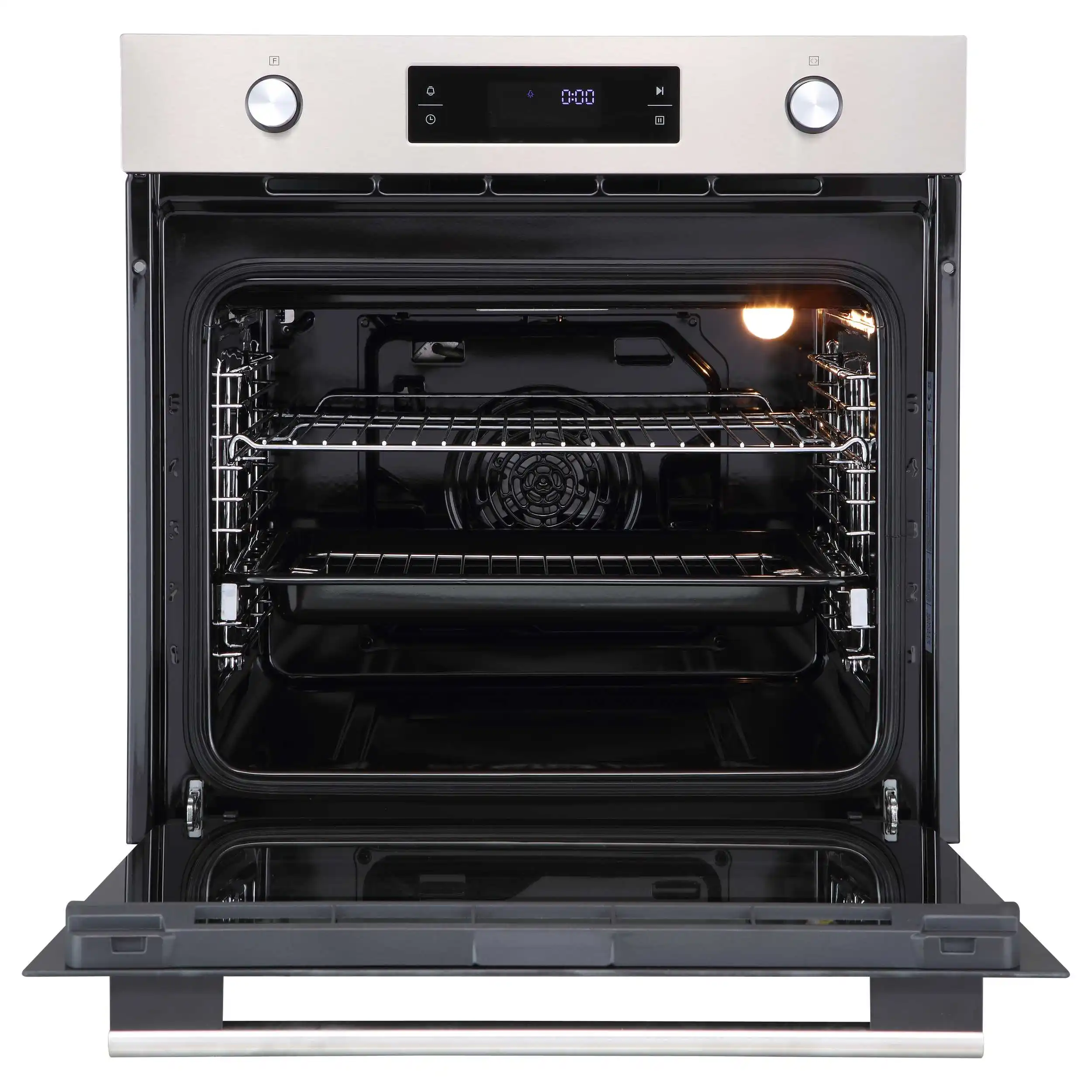 Электронный таймер поможет установить время продолжительности приготовления, после которого духовой шкаф остановит свою работу, а также установить время отложенного старта, который включит духовой шкаф в необходимый момент и самостоятельно отключит его по истечению времени. Электронный таймер позволяет устанавливать акустический сигнал, который подается по истечению заданного времени даже, если духовой шкаф не находится в режиме приготовления.