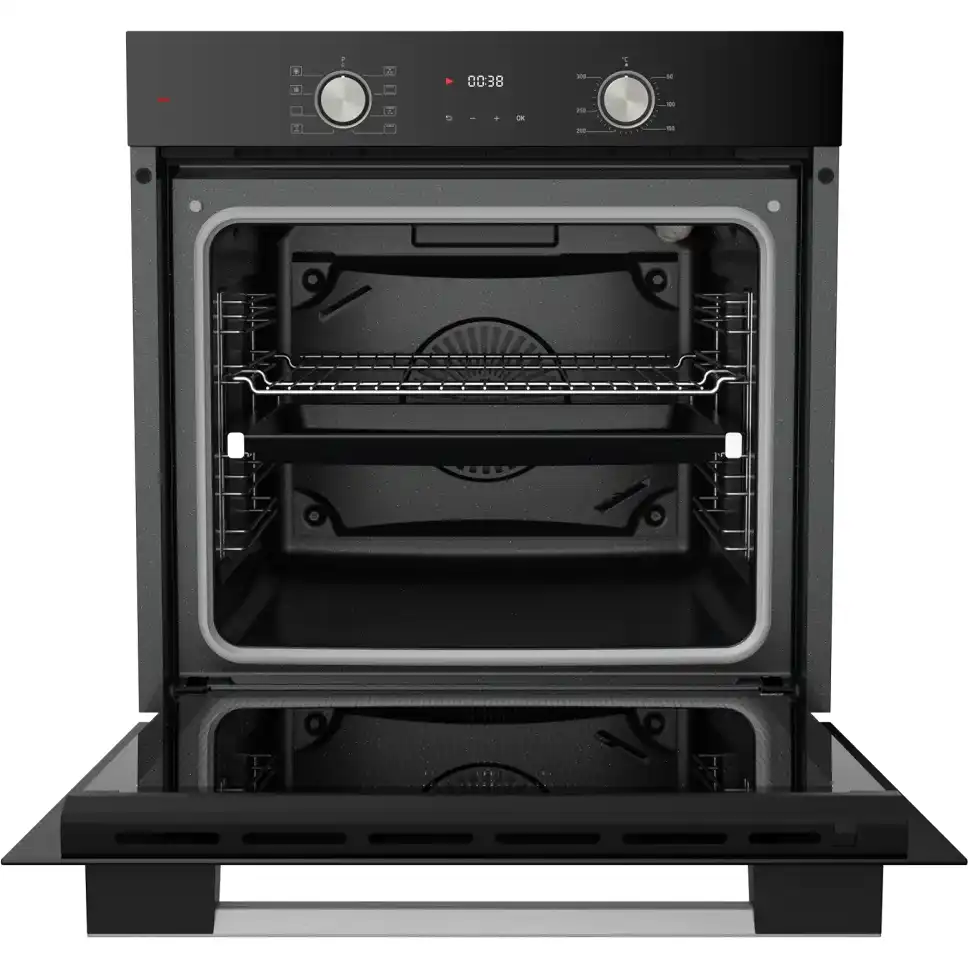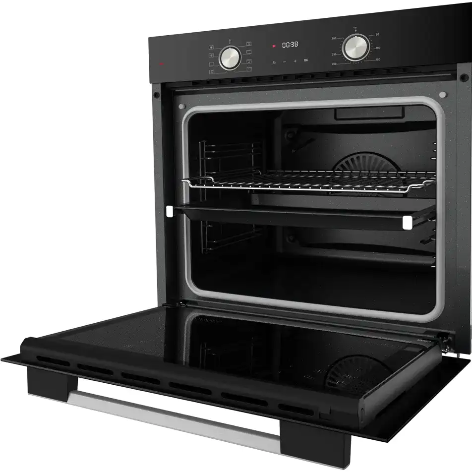 Модель оснащена двумя слоями закаленного стекла в дверце — снаружи она не становится горячей. Дверца снимается — ее удобно мыть. Доводчик обеспечивает плавное закрывание без хлопка. Эмаль легкой очистки значительно упрощает уход за внутренней поверхностью духового шкафа.