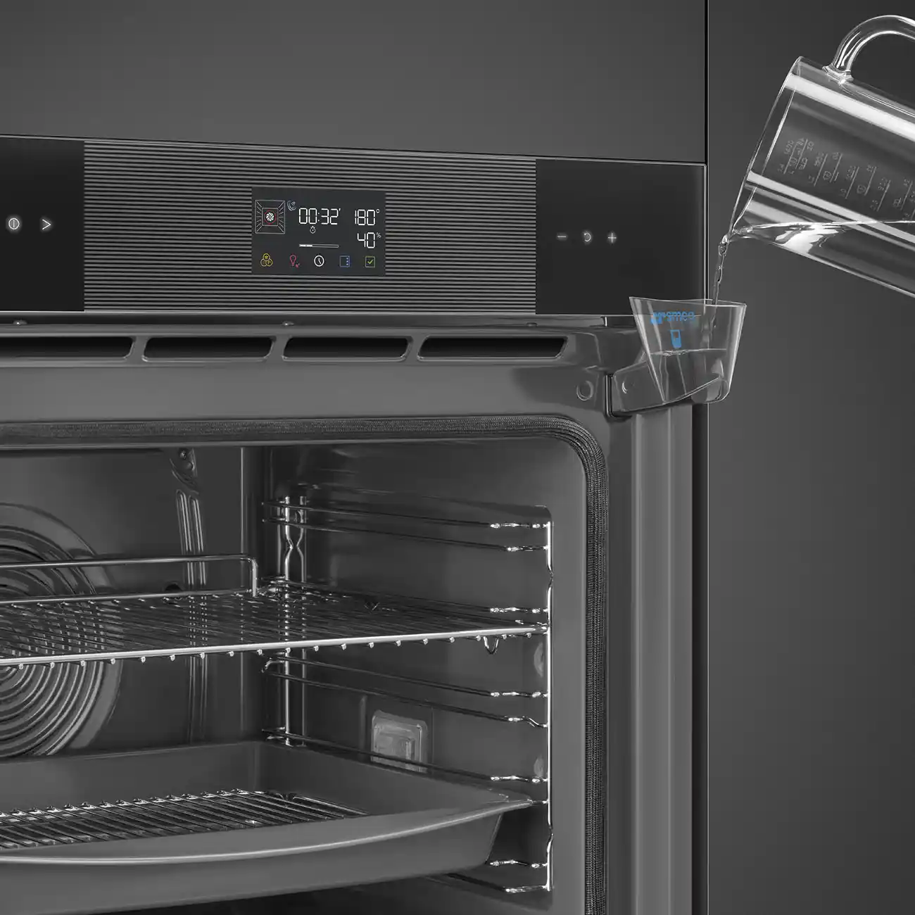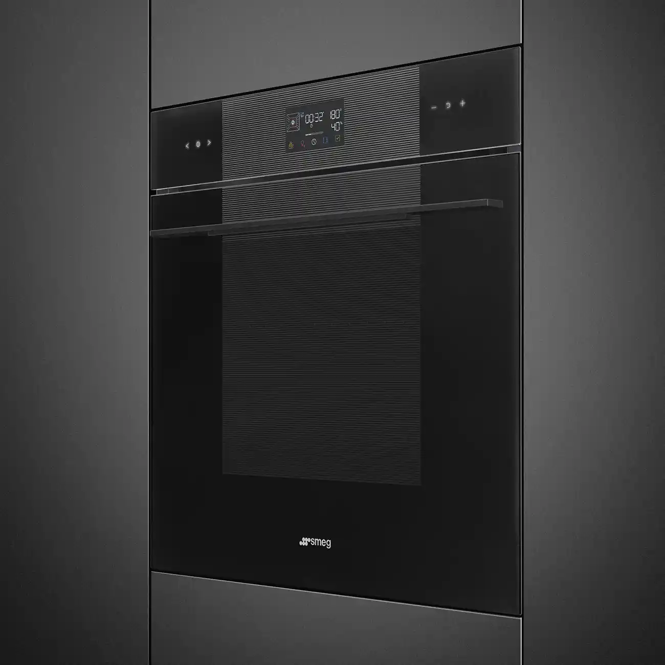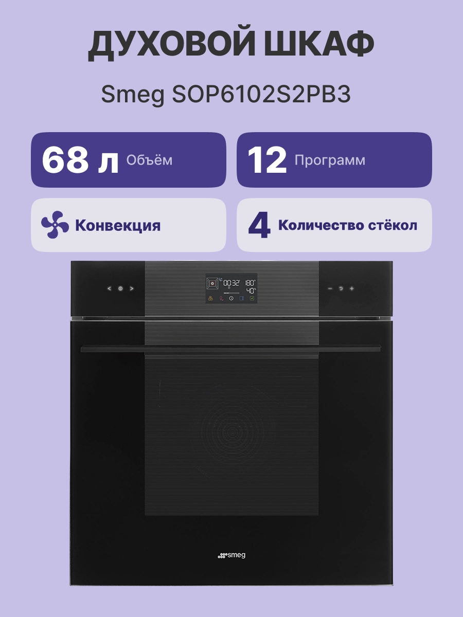 Электрический духовой шкаф Smeg SOP6102S2PB3 оснащен сенсорной панелью. Таймер используется для отсрочки начала работы, установки продолжительности кулинарного процесса. Информация о заданных параметрах отображается на дисплее.