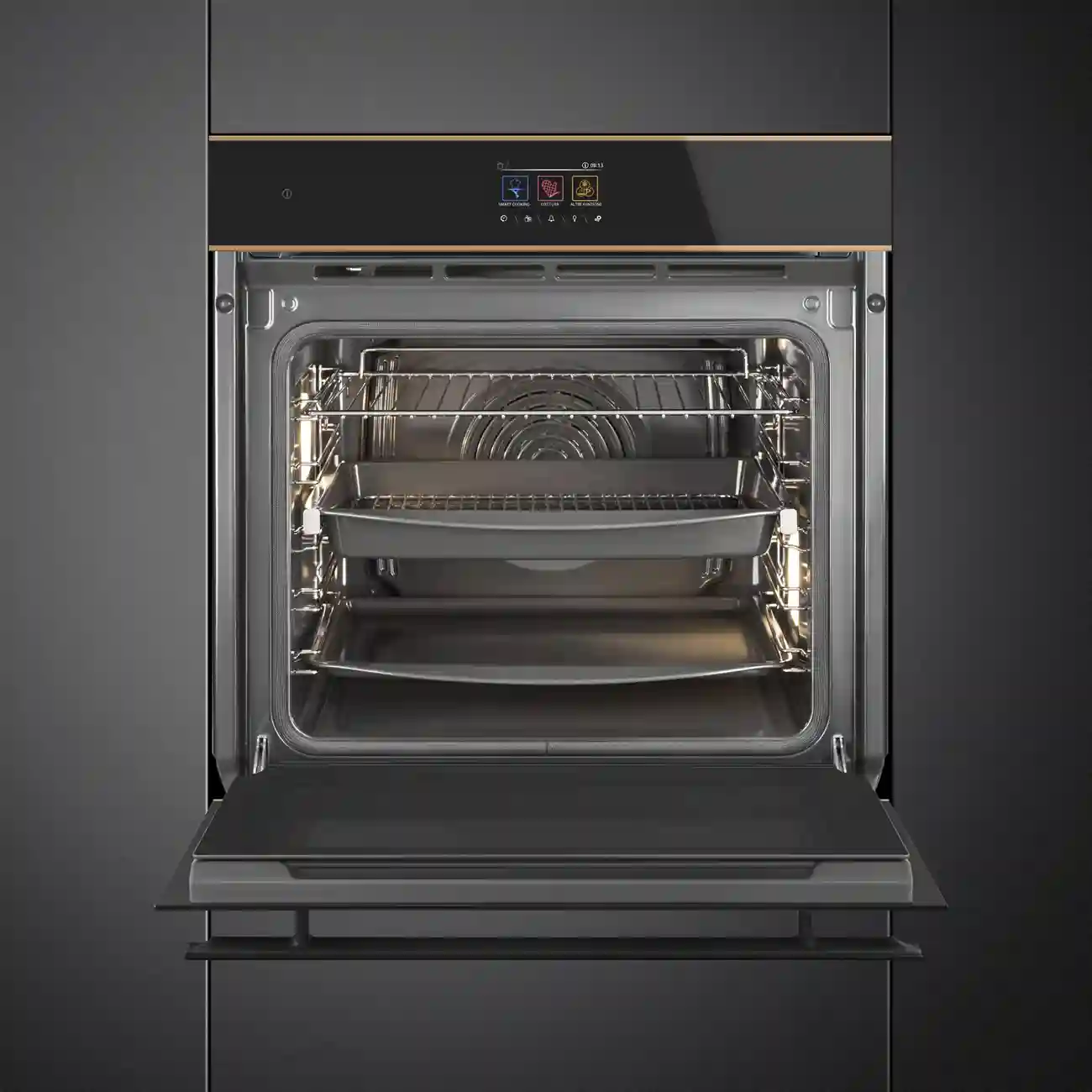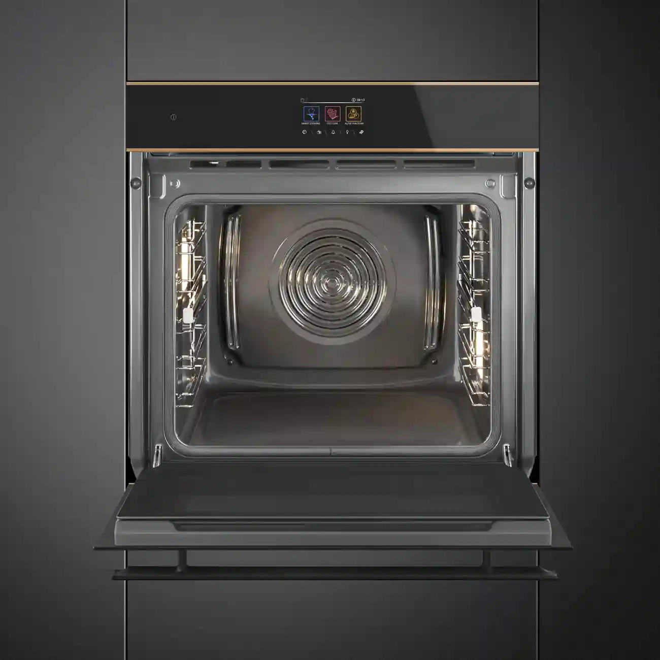 Духовой шкаф SMEG SOP6604TPNR выполнен в стильном цвете чёрное стекло Eclipse с медным профилем, что придает ему элегантный и современный вид. Черное стекло не только выглядит стильно, но и устойчиво к царапинам и другим повреждениям, что гарантирует долговечность и сохранность внешнего вида. Медный профиль добавляет изысканности и оригинальности дизайну, делая его уникальным дополнением любой кухни.