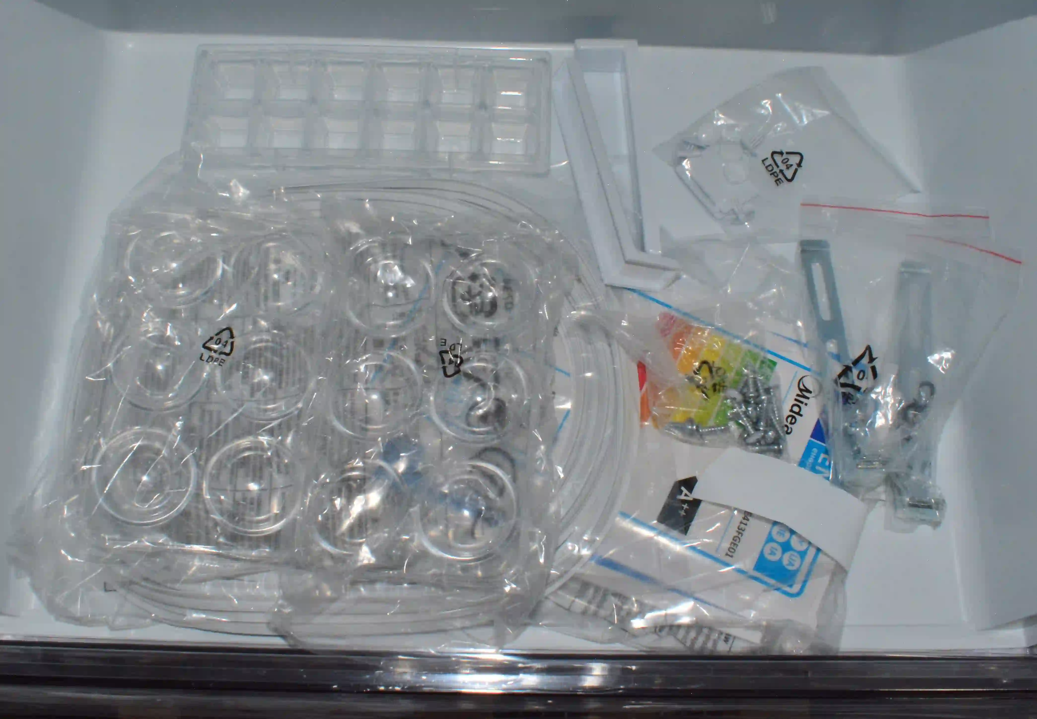 Комплектность: Документация, 2 лотка для яиц, форма для льда, набот крепежа, уплотнитель.