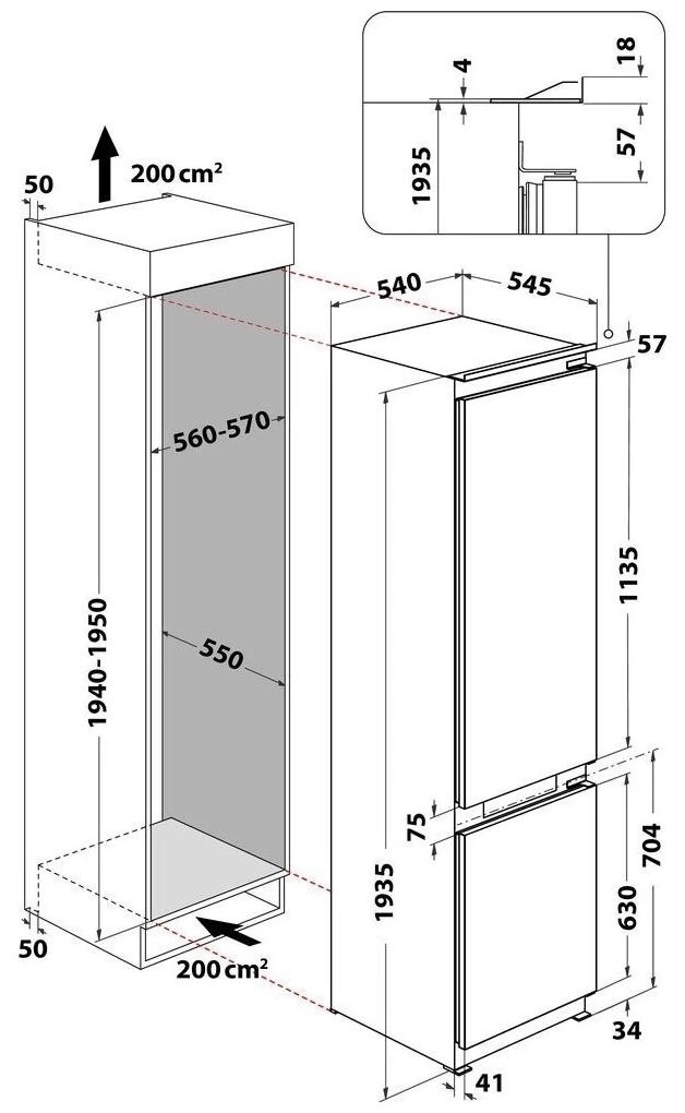 Встраиваемый холодильник Whirlpool WHC20T352 представляет собой компактное и функциональное устройство с габаритами 193×54,5×54 см. Его общий полезный объём составляет 250 литров, включая холодильную камеру вместимостью 182 литров и морозильную камеру объёмом 68 литров. Модель оснащается системой Full No Frost, обеспечивающей отсутствие льда и снежной шубы на стенках камер благодаря автоматической разморозке.