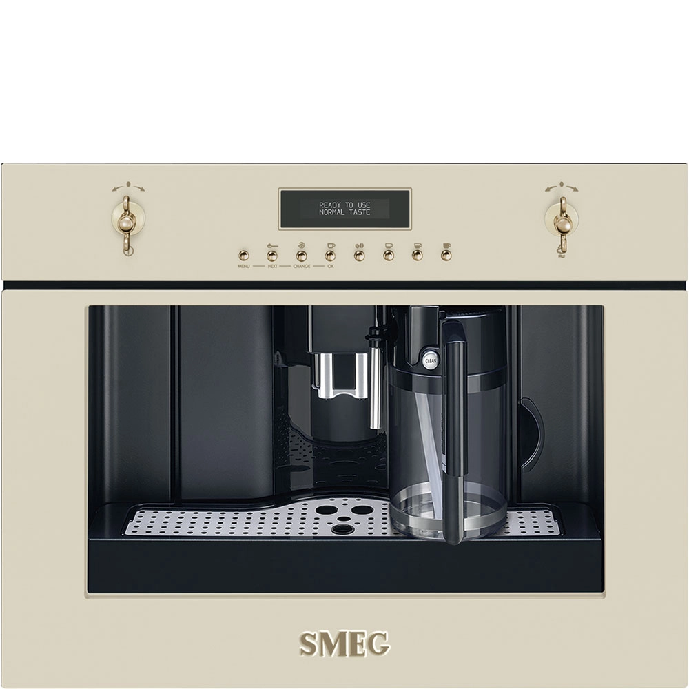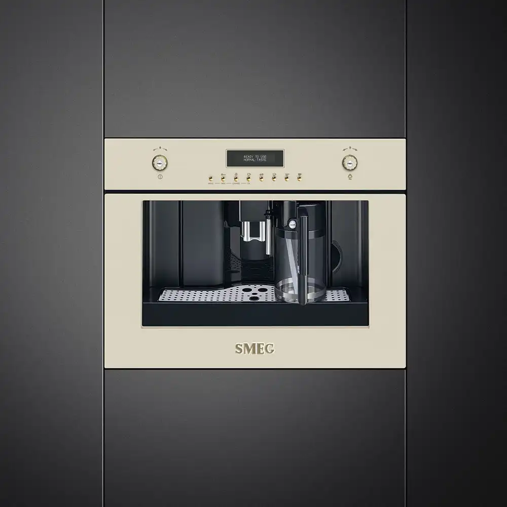 Автоматическая встраиваемая кофемашина SMEG CMS8451P из коллекции Coloniale с удобным управлением позволяет быстро настроить программу и приготовить кофе в домашних условиях. Кофемашина сочетает в себе элементы ретро в виде поворотного управления с латунными переключателями, и современного стиля благодаря LCD дисплею и подсветке рабочего пространства кофемашины при включении.