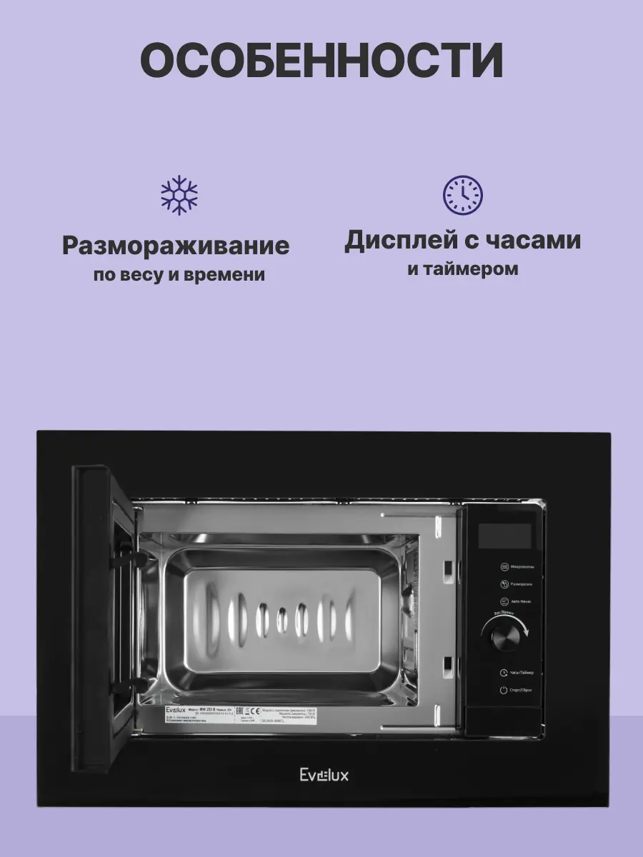 EVELUX MW 253 B — это стильная, многофункциональная встроенная микроволновая печь с передовыми технологиями управления и безопасностью. Ее современный дизайн, компактность и богатый функционал делают ее идеальным выбором для тех, кто ценит качество, комфорт и эстетику в повседневной жизни. Эта модель станет надежным помощником для быстрого приготовления вкусных блюд и создания уютной атмосферы на вашей кухне.