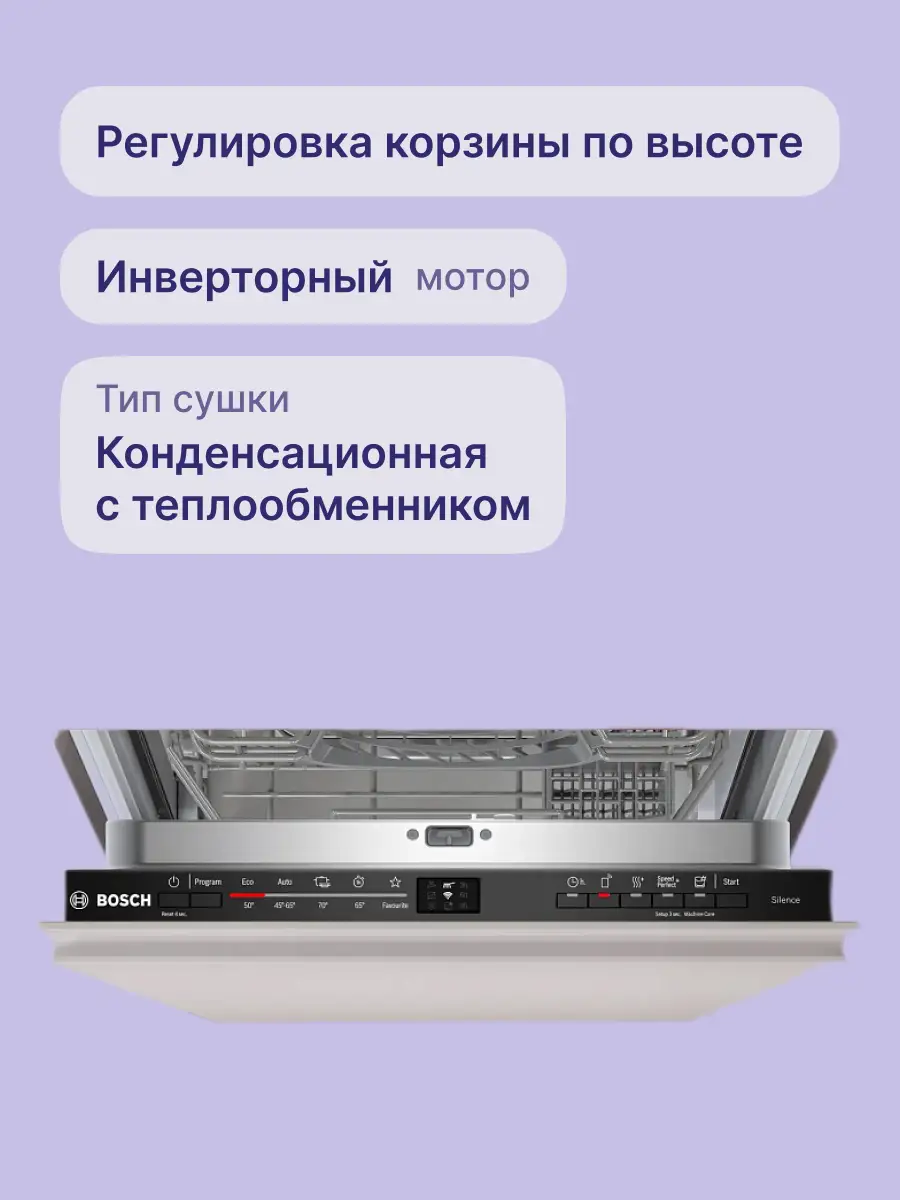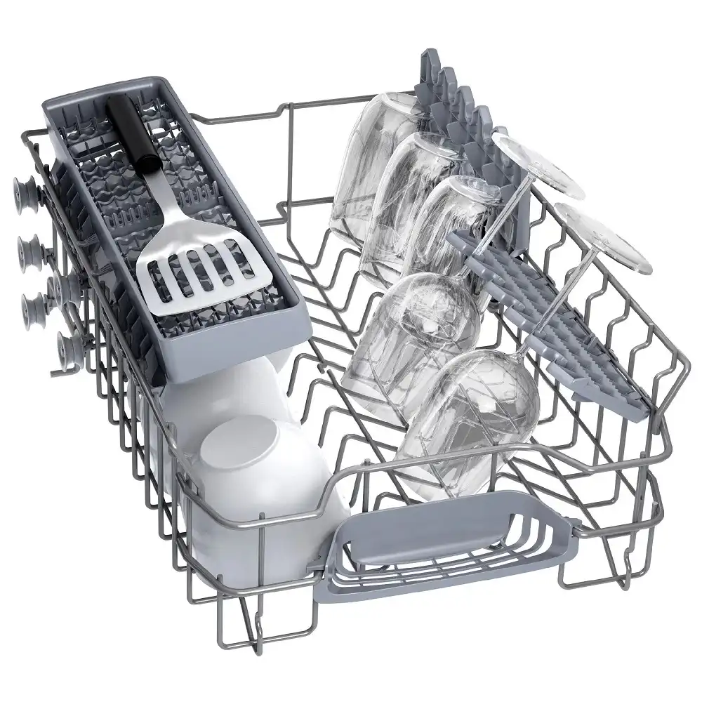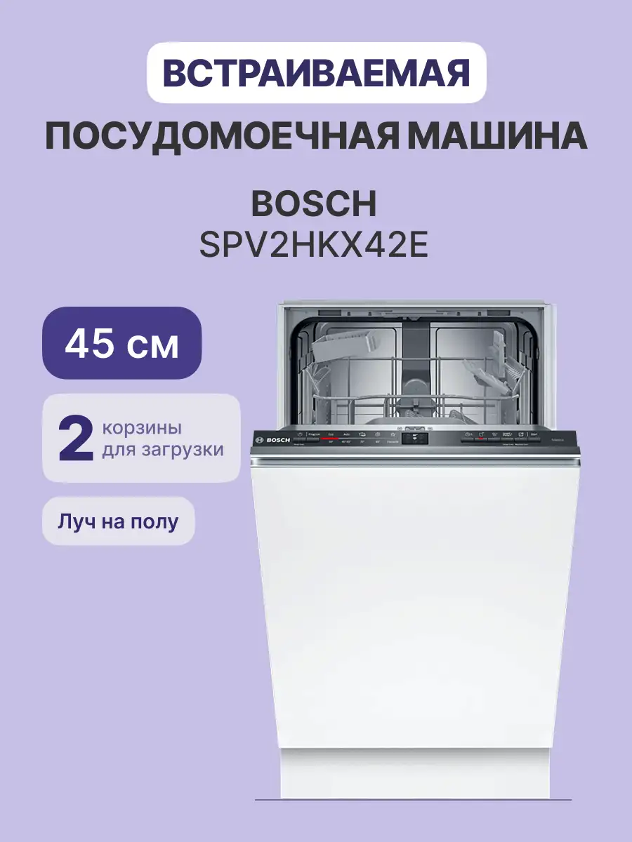 Встраиваемая посудомоечная машина BOSCH SPV2HKX42E, черная — узкая модель габаритами 44,8x55x81,5 см, которая вмещает до 9 комплектов посуды. В этой модели электронное кнопочное управление, все параметры работы наглядно отображены на панели пиктограммами, активные установки отображают светодиодные индикаторы. Предусмотрен и индикатор InfoLight — луч на полу, который погаснет, когда цикл завершится.