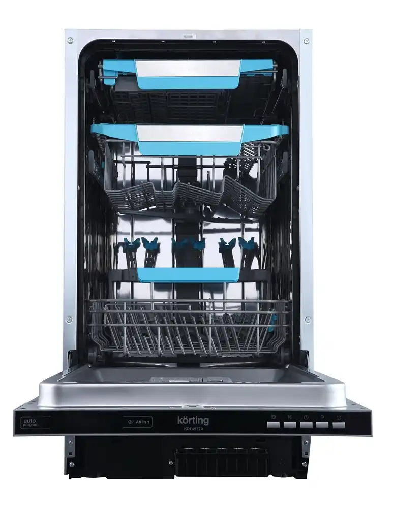 Korting KDI 45570 оснащена механическими кнопками на панели управления. В числе доступных программ — интенсивная мойка, деликатная мойка для хрупкой посуды, экономичный и быстрый режимы, а также программа «Baby Care». Это разнообразие позволяет выбрать оптимальный вариант в зависимости от типа загрязнения и материала посуды.