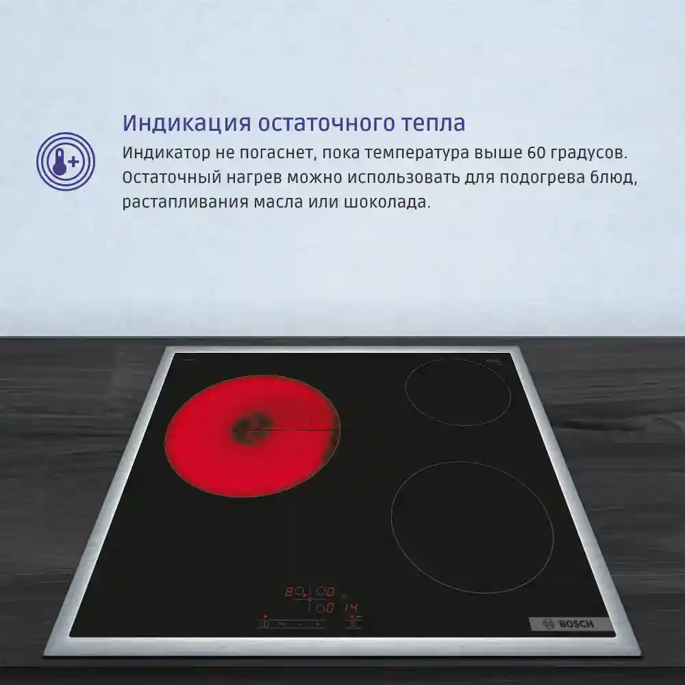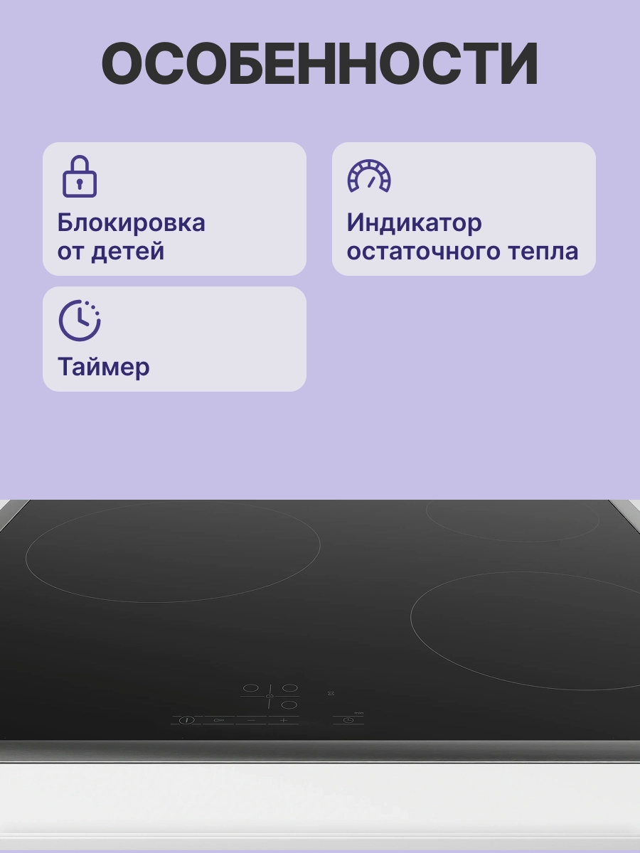Производитель уделил особое внимание безопасности. В панели реализована защита от перегрева, которая отключает прибор в критической ситуации. Функция блокировки от детей предотвращает случайную активацию или изменение настроек. Индикатор остаточного тепла предупреждает, что поверхность еще горячая, даже после выключения конфорки, что помогает избежать ожогов.