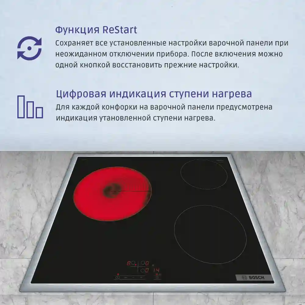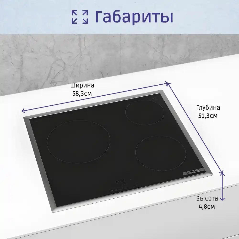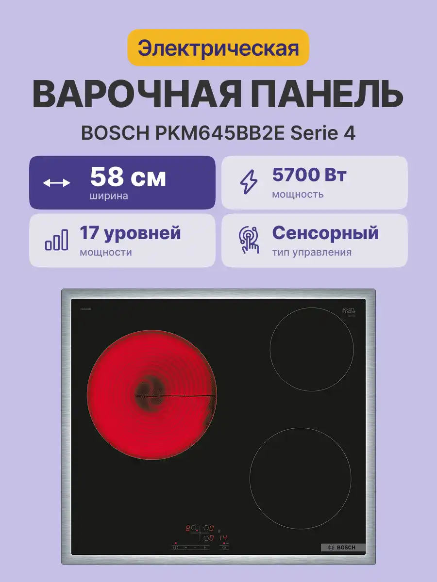 Электрическая варочная панель Bosch PKM645BB2E — это компактное и стильное решение для современной кухни, сочетающее в себе инновационные технологии, продуманный дизайн и высокий уровень безопасности. Она идеально подходит для приготовления самых разных блюд, обеспечивая пользователю максимальный комфорт и контроль над процессом.