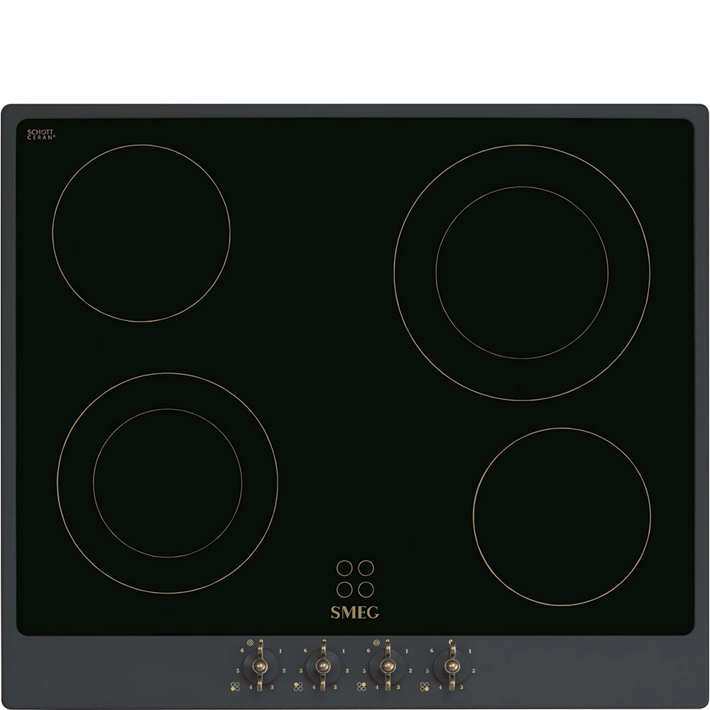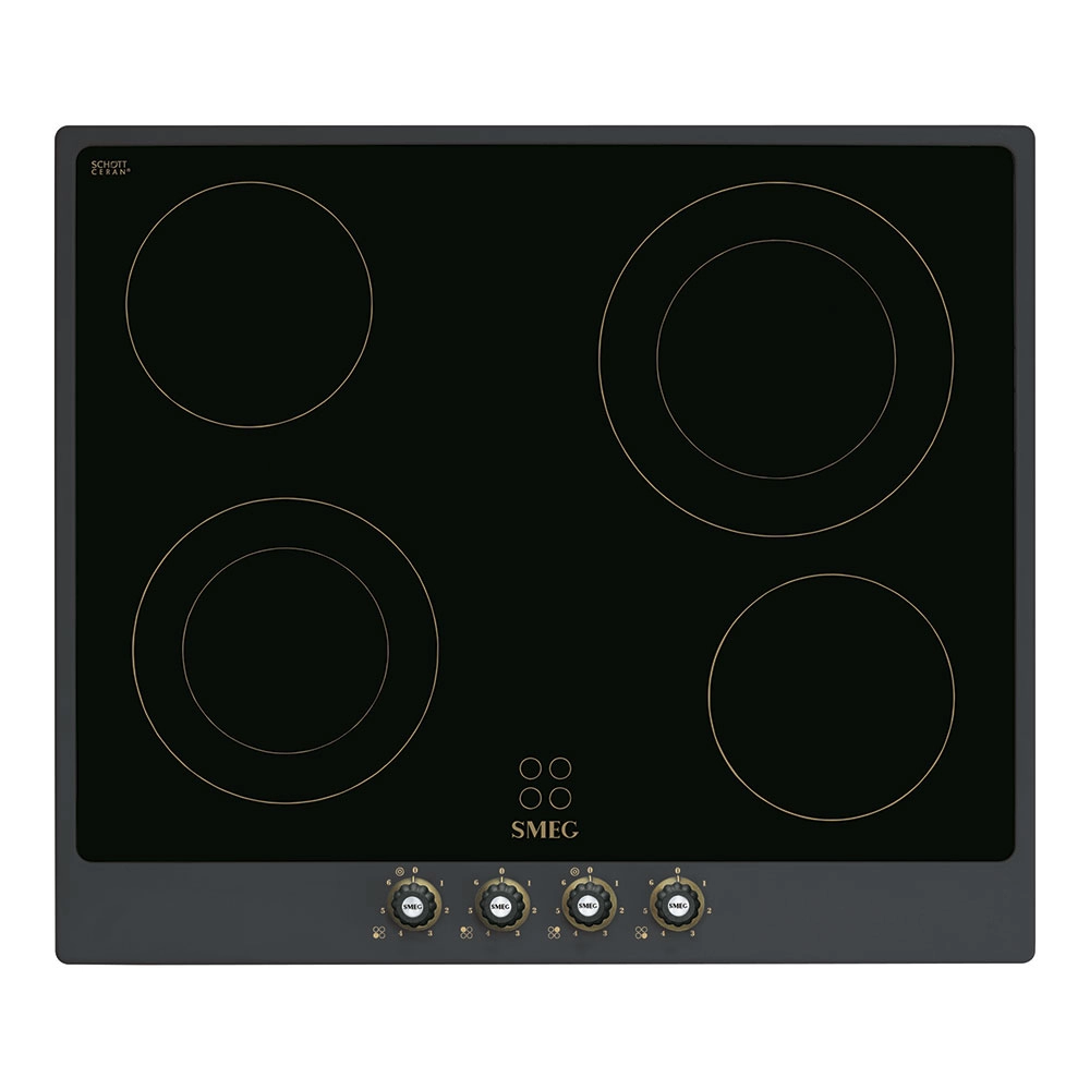Варочная панель SMEG P864AO из серии Coloniale выполнена из черной стеклокерамики Suprema и дополнена рамкой цвета «антрацит». Данная модель оснащена 4 конфорками Hi-Light, 2 из которых — двухконтурные, что позволяет выбирать зону нагрева в зависимости от диаметра используемой посуды. С помощью поворотных переключателей настроить работу устройства можно быстро и легко. Безопасность эксплуатации гарантирует защита от перегрева.