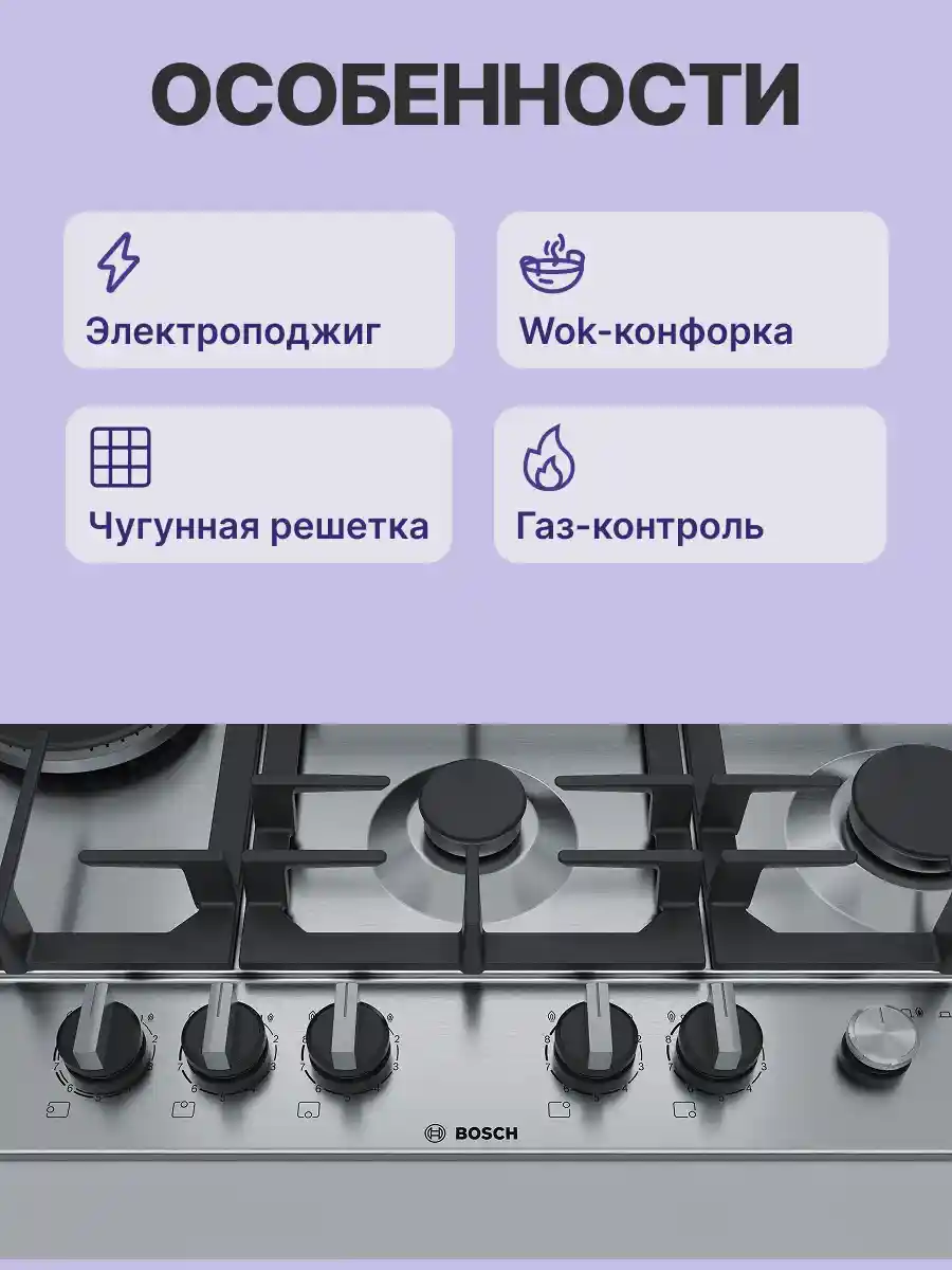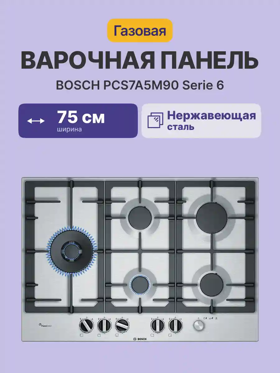 Встраиваемая газовая панель BOSCH PCS7A5M90, нержавеющая сталь