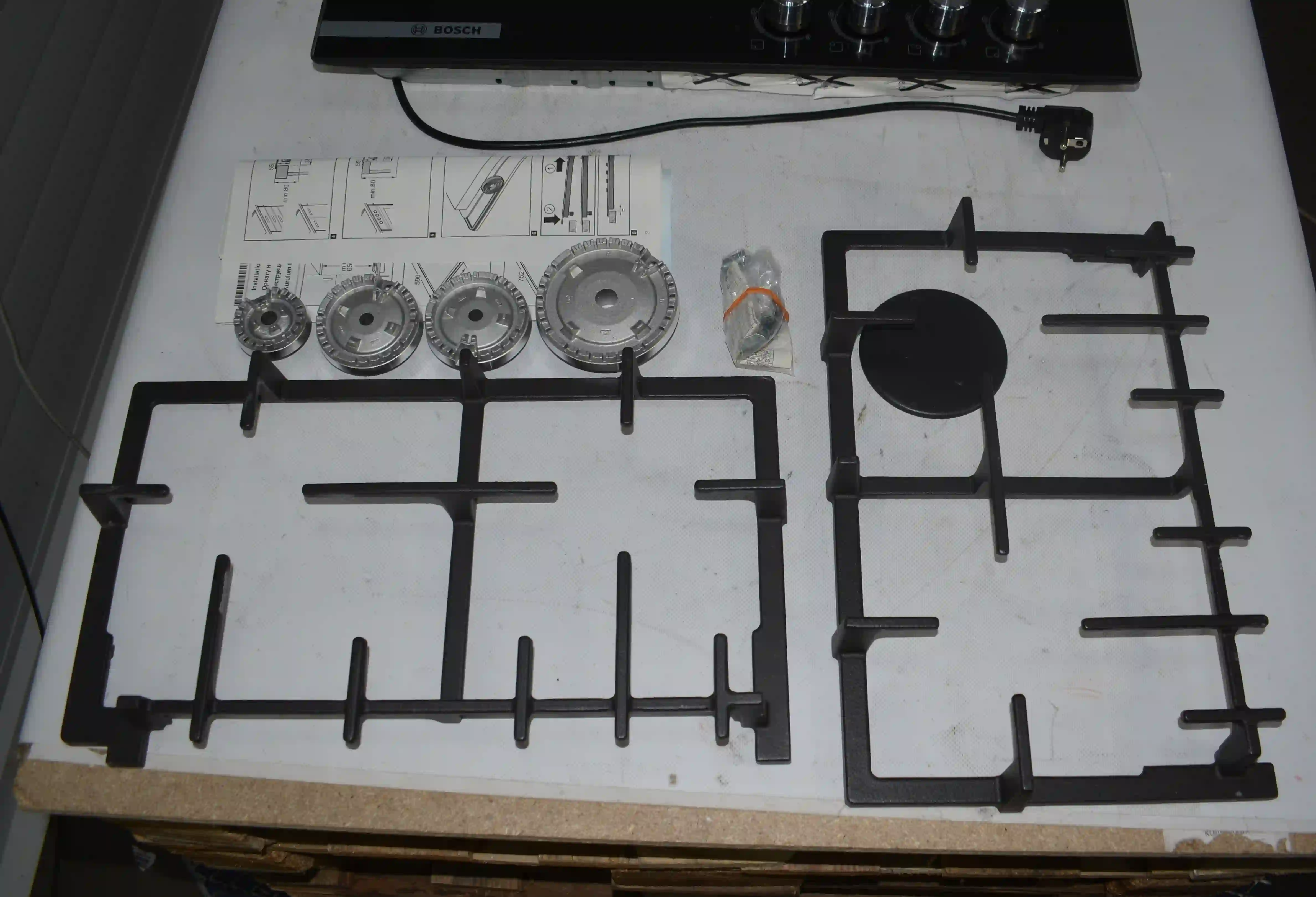 Комплектность: документация,конфорка 4 шт,металлический блин,2 чугунные решетки,комплект крепления