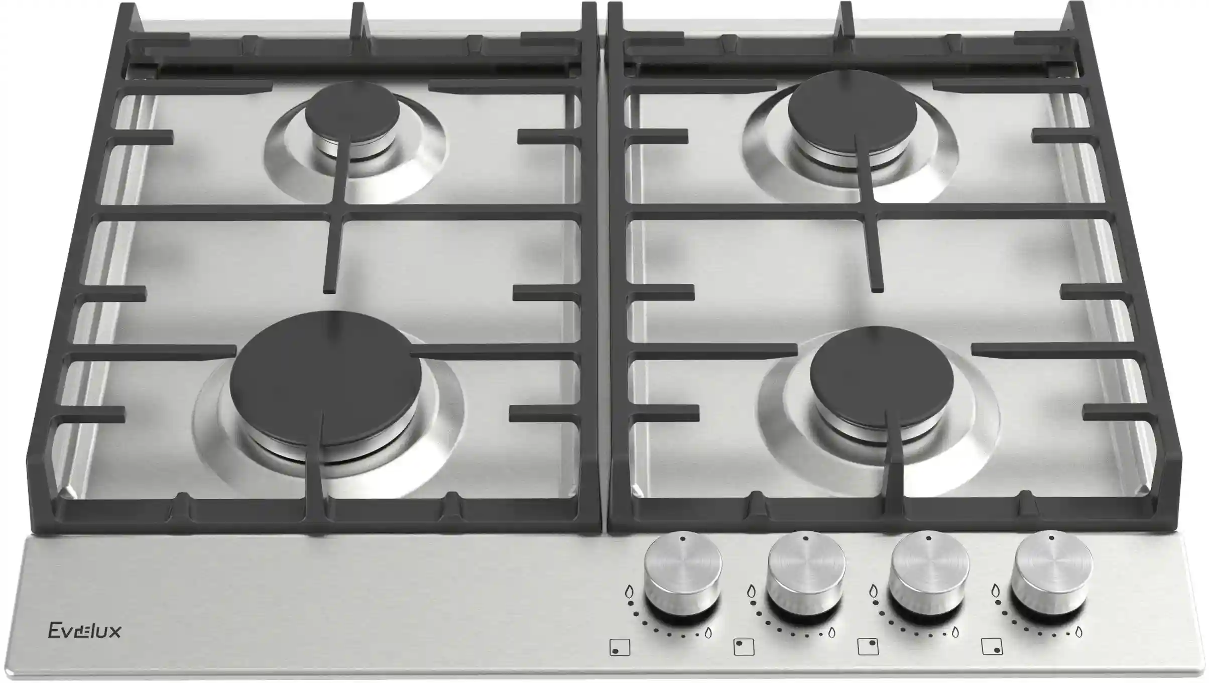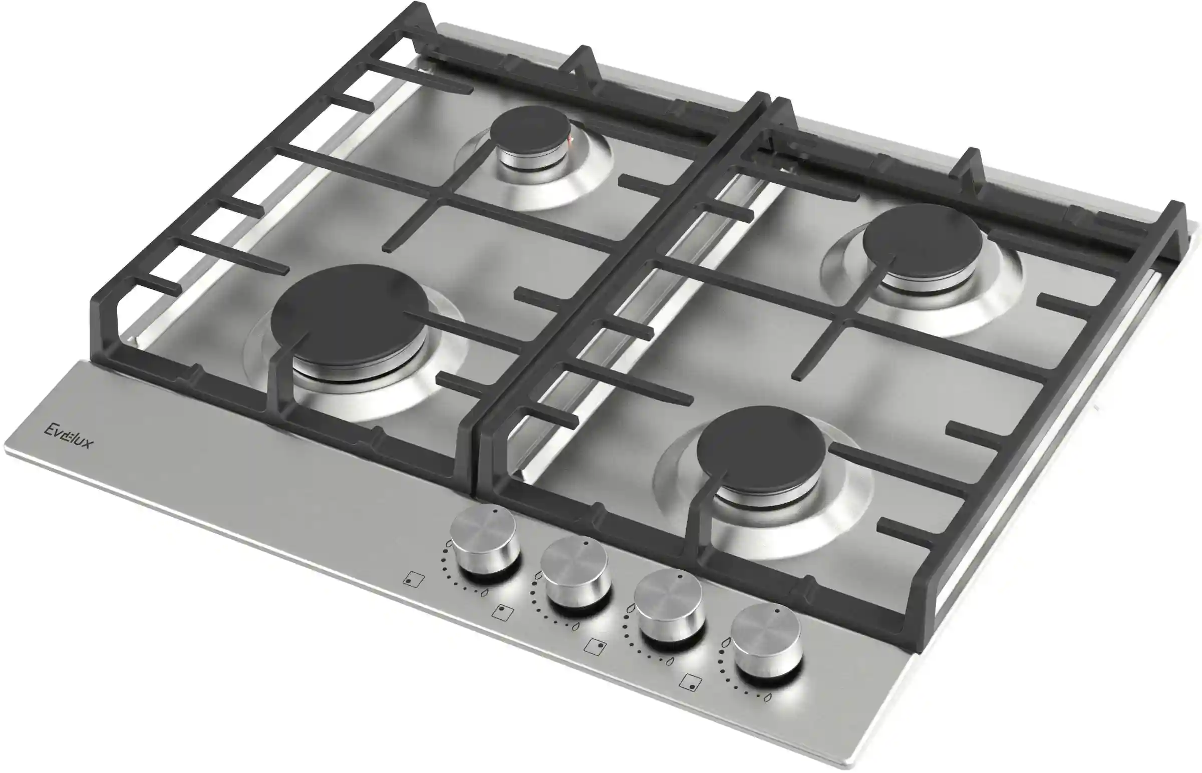 Поворотные регуляторы газовых варочных поверхностей Evelux выполнены из металла, что создает профессиональный стиль и препятствует их перегреву.