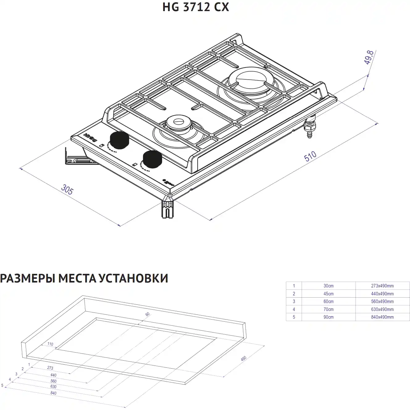 - Количество газовых конфорок: 2
