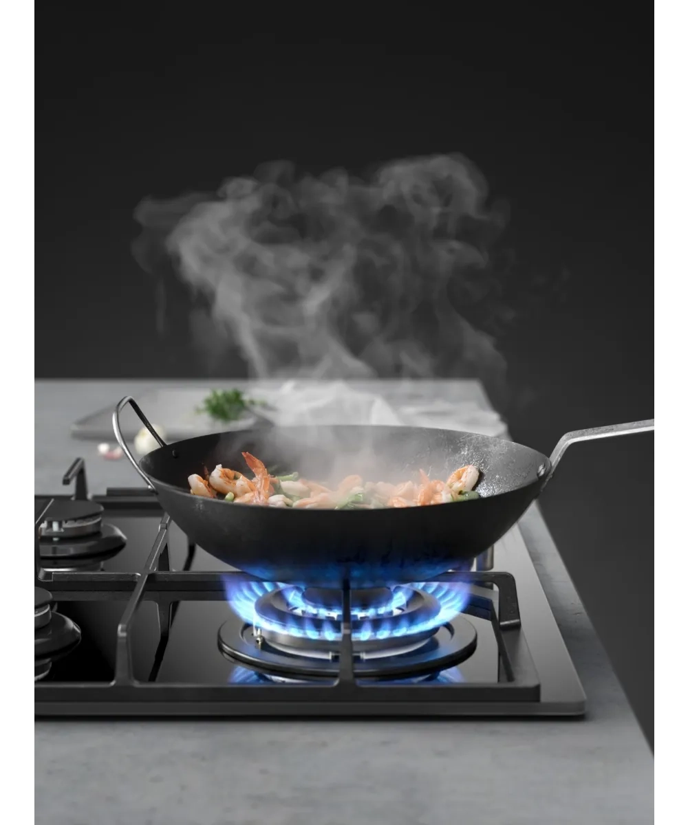 На панели установлены четыре конфорки SABAF. Они равномерно распределяют пламя и быстро нагревают посуду. Особого внимания заслуживает мощная WOK-конфорка на 3,4 киловатта. Она создает интенсивное пламя, идеальное для вок-сковороды — овощи остаются хрустящими, а мясо сохраняет сочность. Остальные конфорки разного размера под любые кастрюли и сковородки.