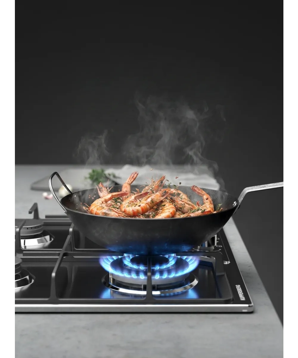 В плите установлены четыре конфорки от известного итальянского производителя SABAF. Они славятся надежностью и эффективным сгоранием газа. Есть отдельная мощная WOK-конфорка на 3.4 кВт. Она идеально подходит для вок-сковороды: быстро нагревается и дает сильное пламя, чтобы жарить овощи или мясо с сохранением сочности. Остальные конфорки разного диаметра для кастрюль и соусников.