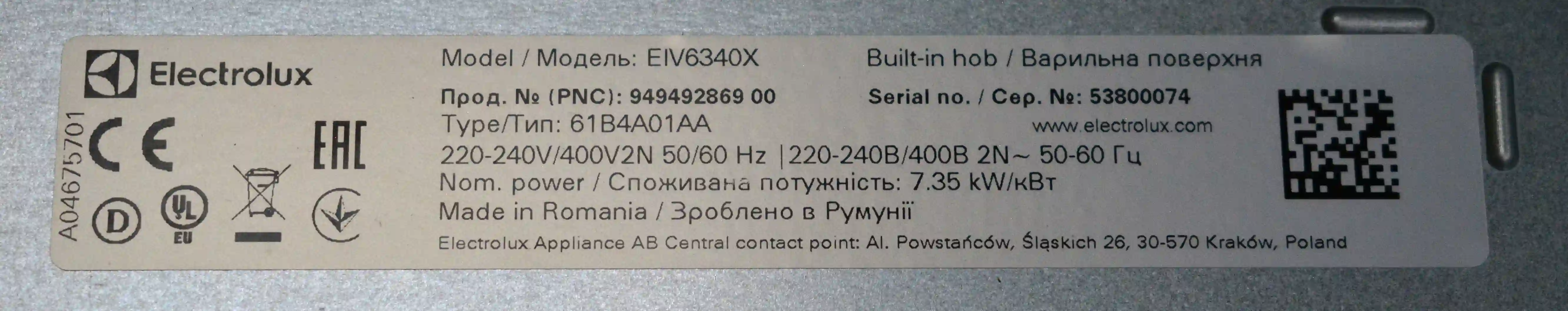 Встраиваемая индукционная панель ELECTROLUX EIV6340X k4 000092432