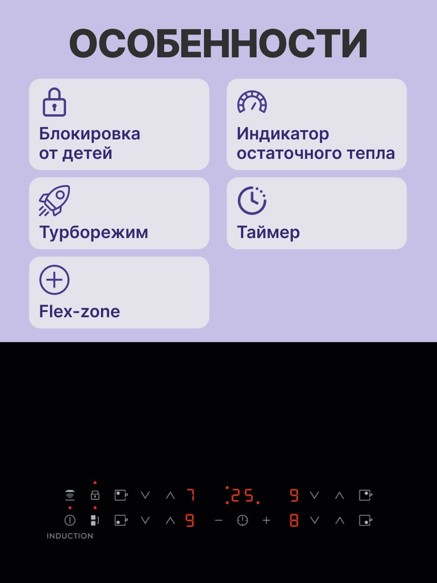 - Материал варочной панели: Закалённое стекло