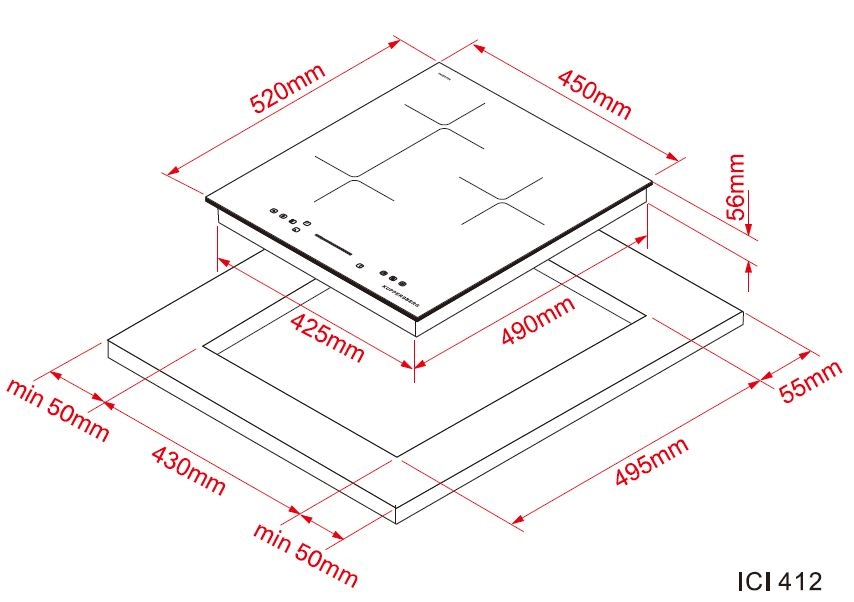 Встраиваемая индукционная панель Kuppersberg ICI 412 имеет габариты 450х520х56 мм и оптимальна для встраивания в нишу размером 430х495 мм.
