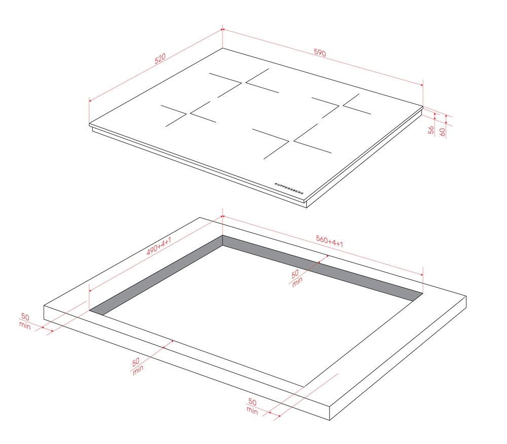 Товар работает от сети 220-240 В и имеет частоту 50-60 Гц. Габариты прибора составляют 59 см в ширину, 6 см в высоту и 52 см в глубину, что делает его универсальным для установки на любой кухне. Габариты ниши для встраивания составляют 56×49 см.