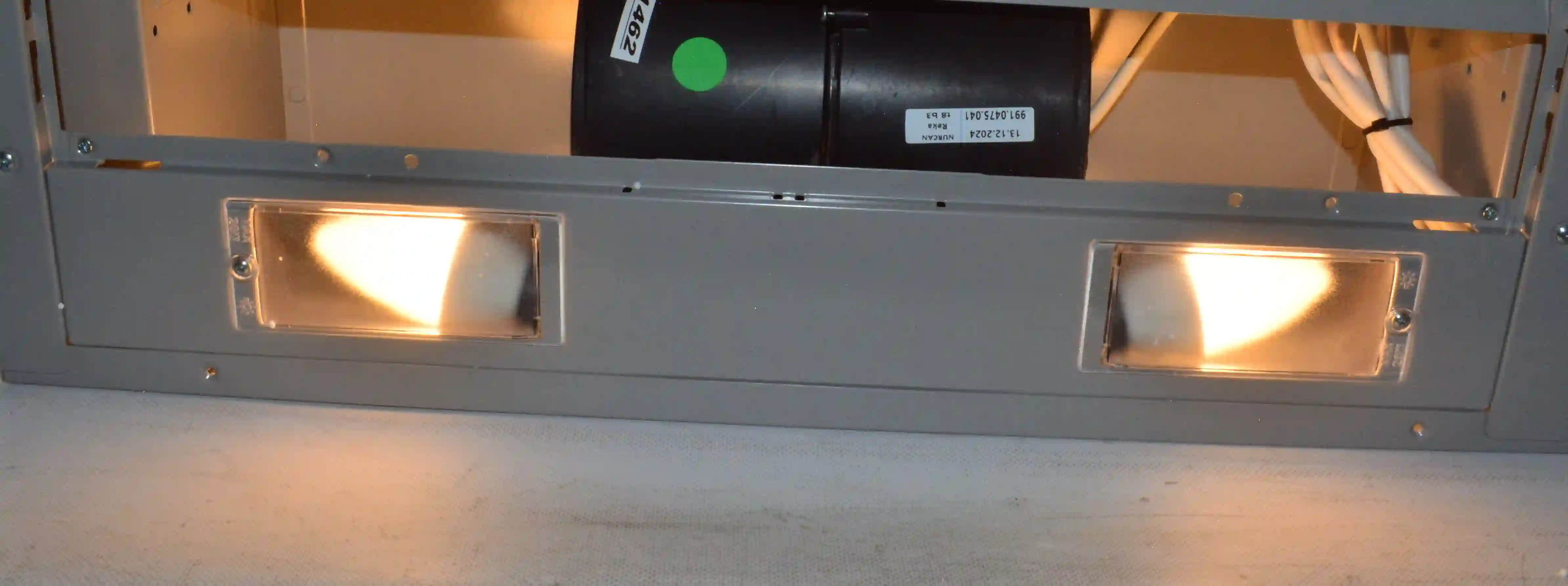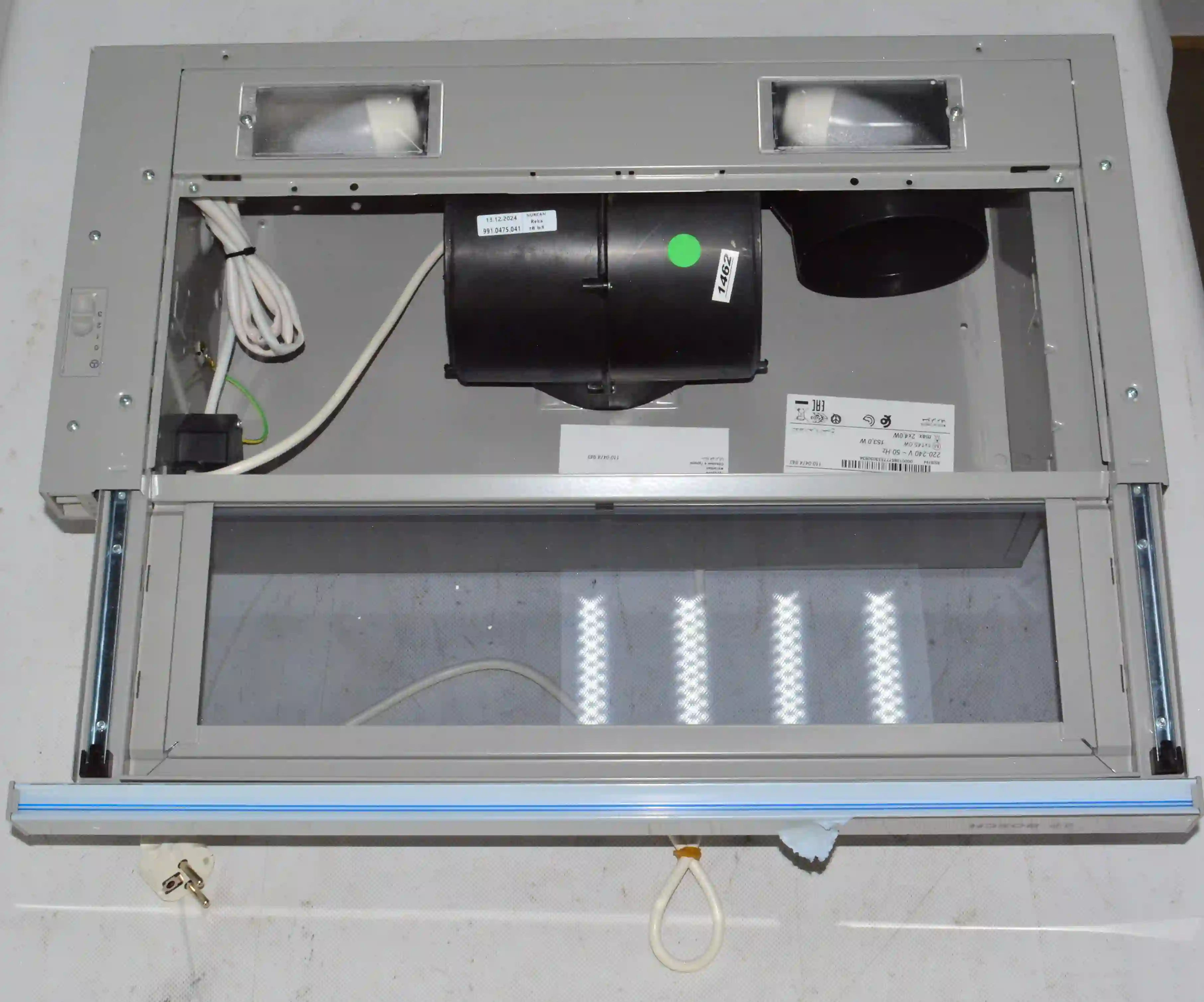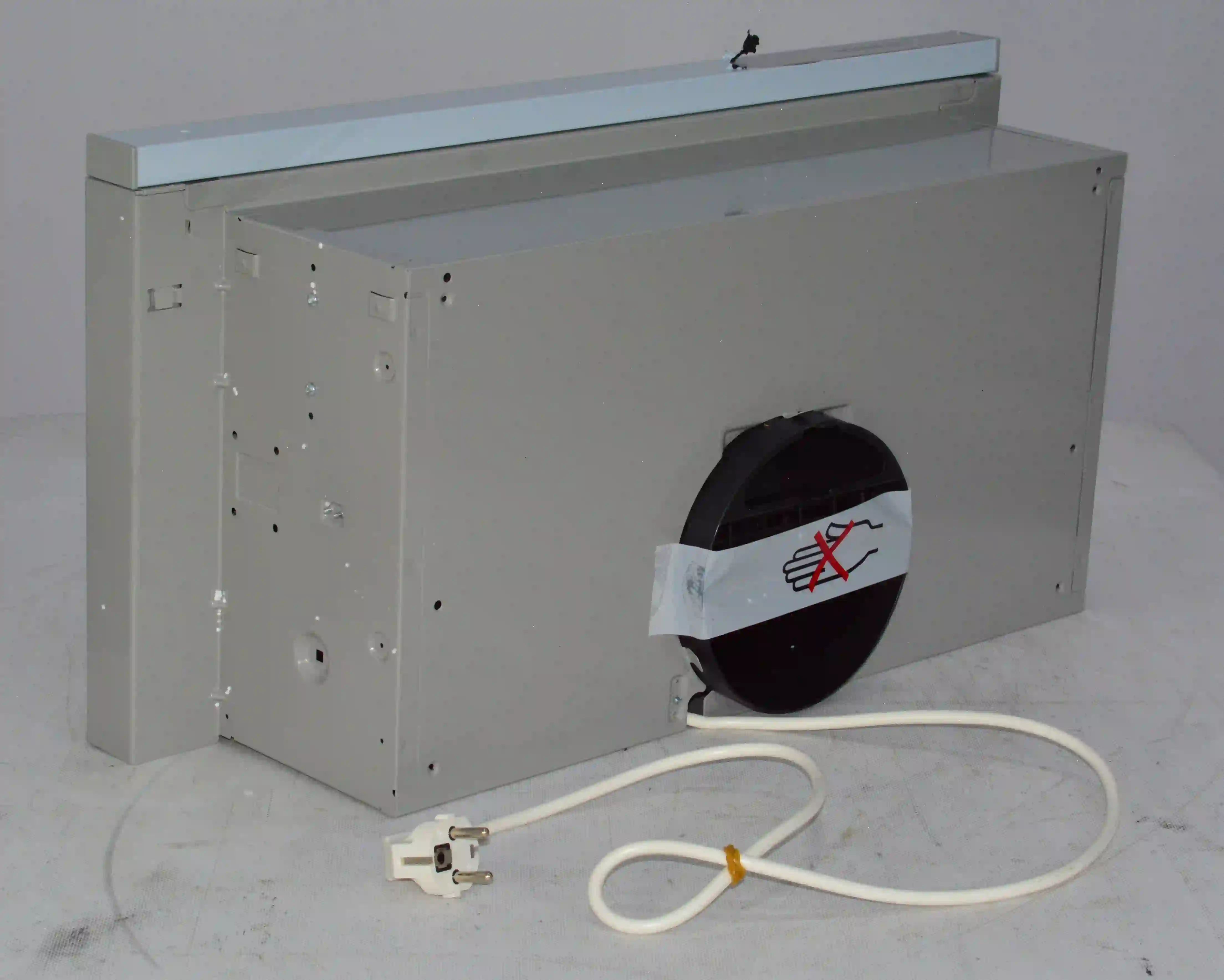 Для установки корпуса размером 13,5х60х28 см в навесной шкаф не требуется использование дополнительных приспособлений. Для подключения устройства к электросети с напряжением 220-240 В предусмотрен кабель длиной 1,3 м. Диаметр воздуховода составляет 150 мм. Съемный жироулавливающий сетчатый фильтр изготовлен из металла и очищается от налета с помощью воды, губки или щетки, моющего средства. Потребляемая мощность вытяжки равна 125 Вт.